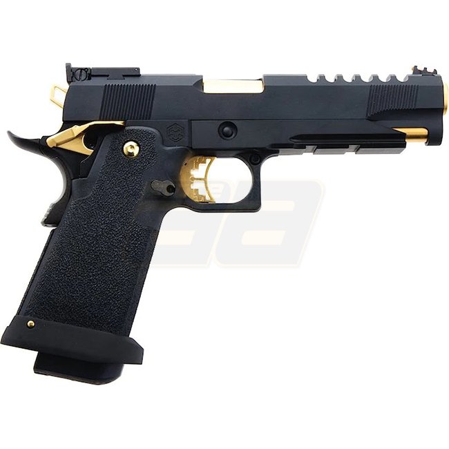 Armorer Works 5.1 Gas Blow Back Pistol HX27 - Gold is a premium airsoft pistol with a metal and polymer construction, featuring a magazine capacity of 30 rounds.