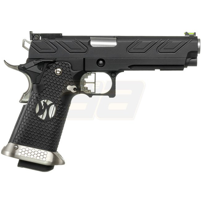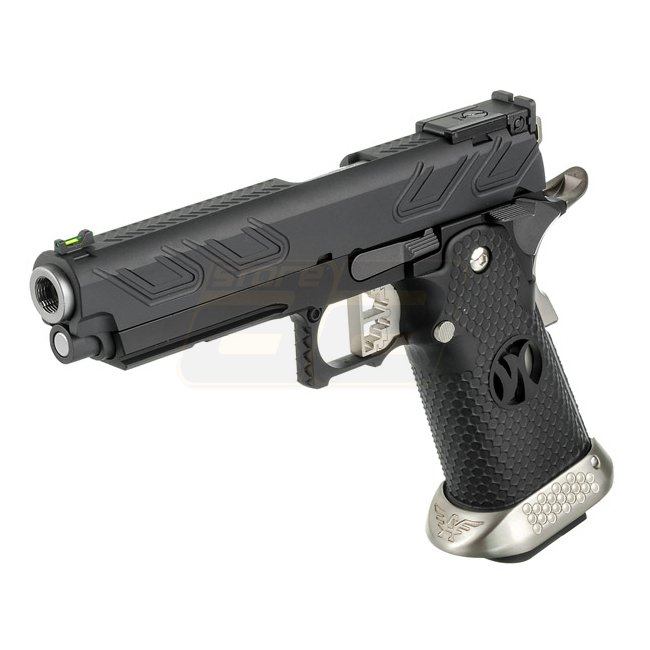 This Armorer Works HX2302 Gas Blow Back Pistol in Black features a metal slide & frame with a plastic grip. It has a magazine capacity of 30 (6mm) and a length of 219mm, weighing 1090g. The inner barrel length is 110mm and it has a muzzle velocity of 320-