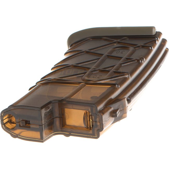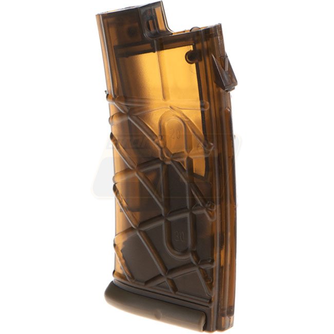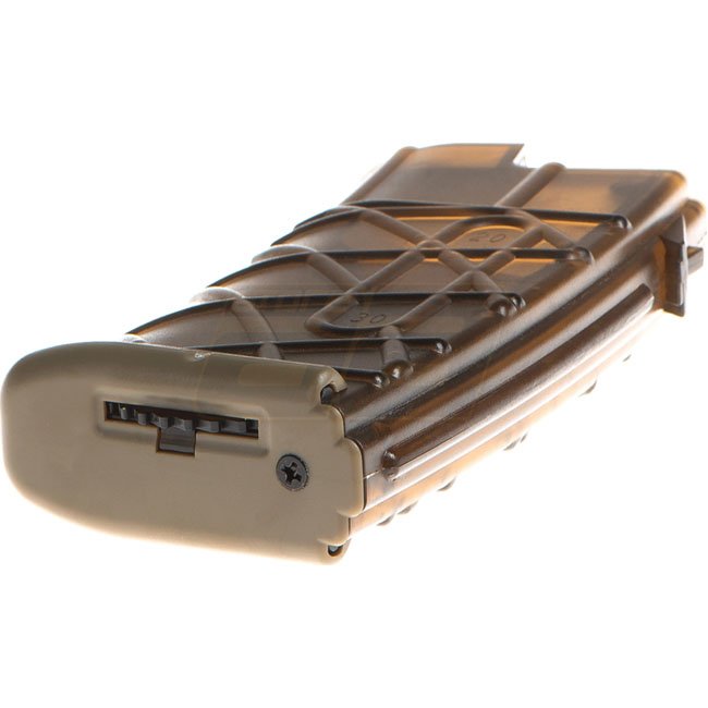 High-capacity 300rds magazine designed for the Army Armament AUG in desert color.