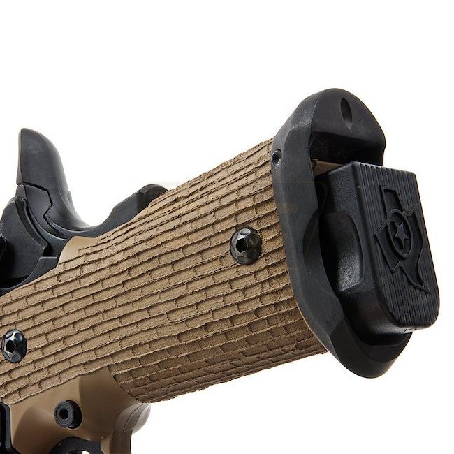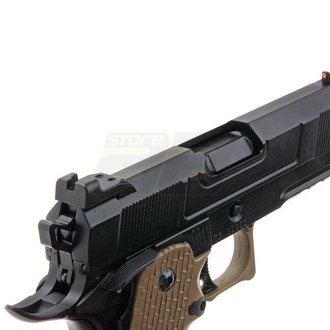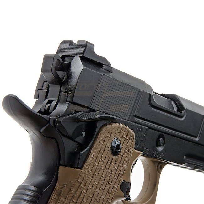 Army Armament R501 Gas Blow Back Pistol - Dark Earth. High-quality gas blowback pistol with metal and polymer construction. Features adjustable hop-up and semi-automatic shooting mode. Comes with a magazine, 28 round capacity, 216mm length, 990g weight, 1