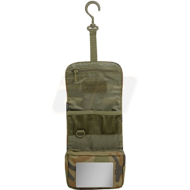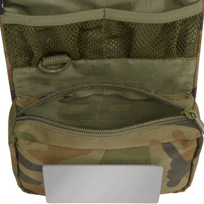 The Brandit Toiletry Bag Medium in Woodland features a versatile design with zipper compartments, mesh pockets, a shatterproof mirror, and a hanging hook. Perfect for organizing your toiletries while on the go!