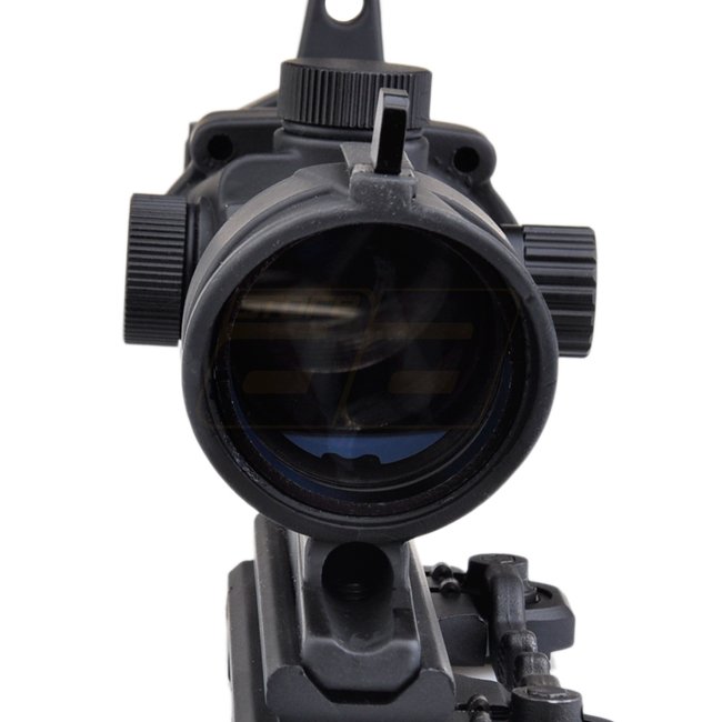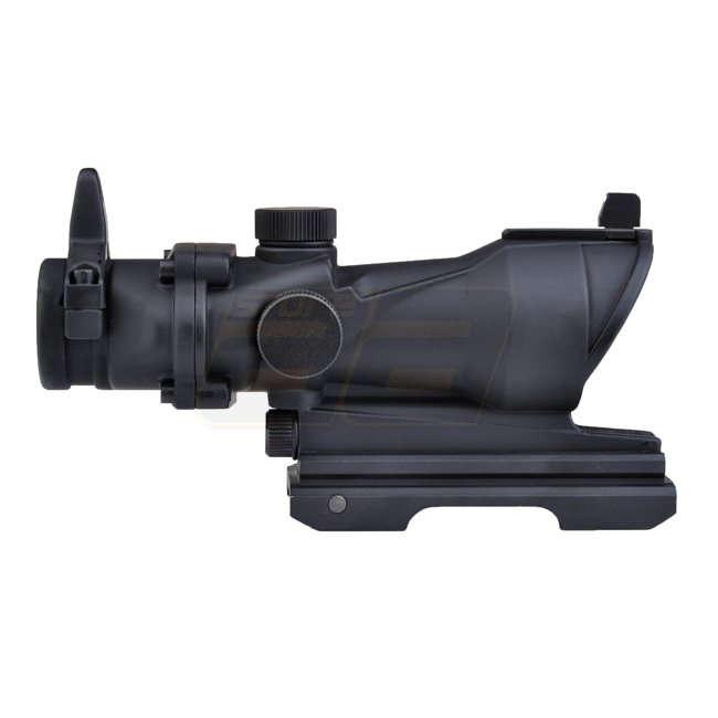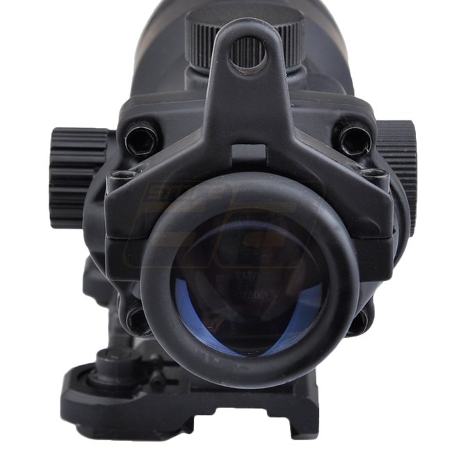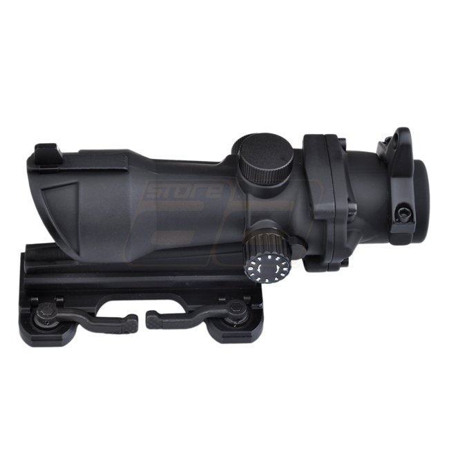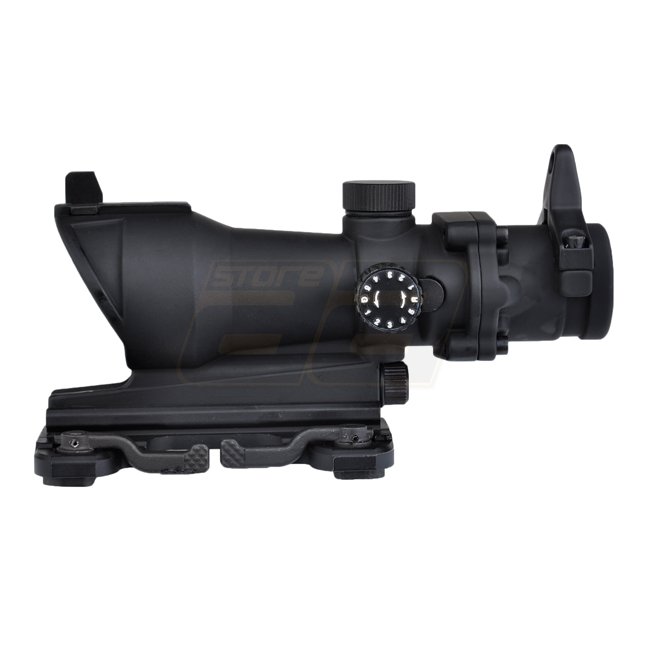 Aim-O ACOG 4x32 QD Montagescope in Schwarz mit roten und grünen Absehen. Vergrößerung: 4x, Durchmesser des Linsens: 32mm, Beleuchtung: Rot und Grün, Absehen: Fadenkreuz, wind- und höhenverstellbar. Montage: 20mm (Picatinny), Länge: 150mm. Batterien: 3x AG