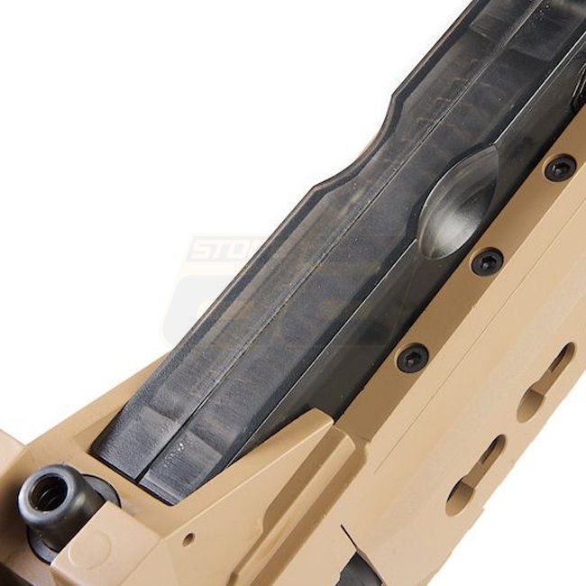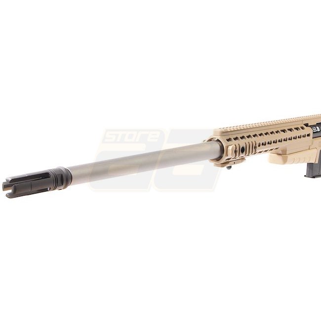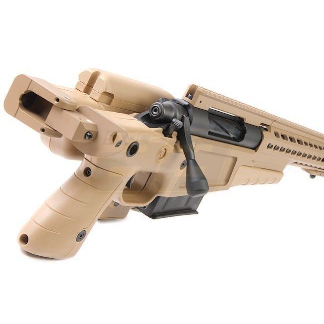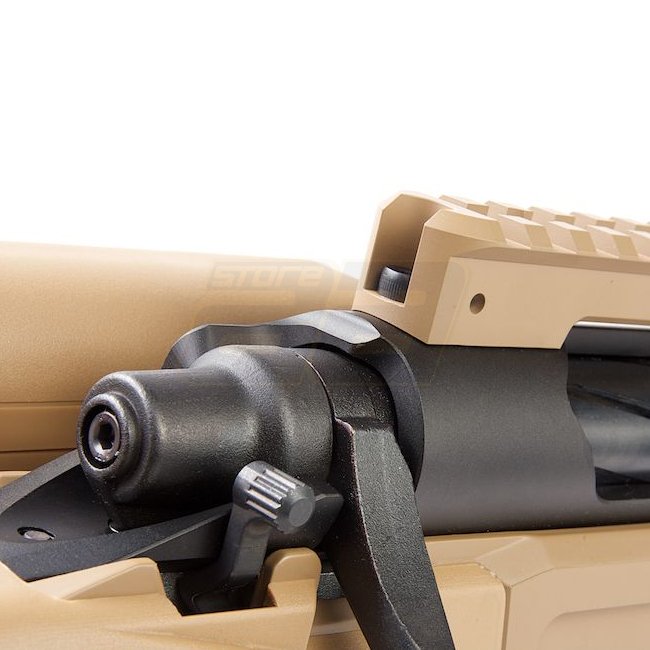 Das Gewehr ist originalgetreu nachgebildet und verfügt über viele feine Details wie eine hervorragende Farbgebung, ein äußerst komfortables Schaftpolster und einen reibungslosen Lauf des Zylinders. Das Gewehr verfügt außerdem über einen KeyMod-Handschutz für die Montage von Zubehör wie Vordergriffe, Zweibeine und Standard Picatinny-Schienen.