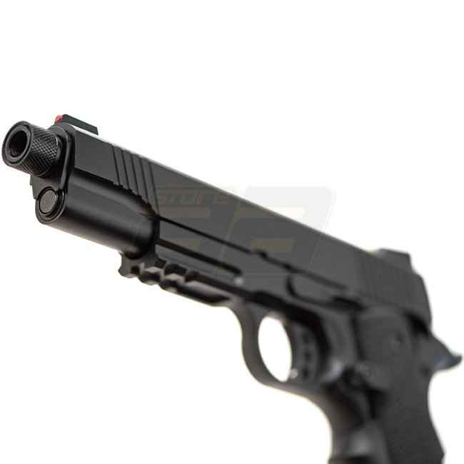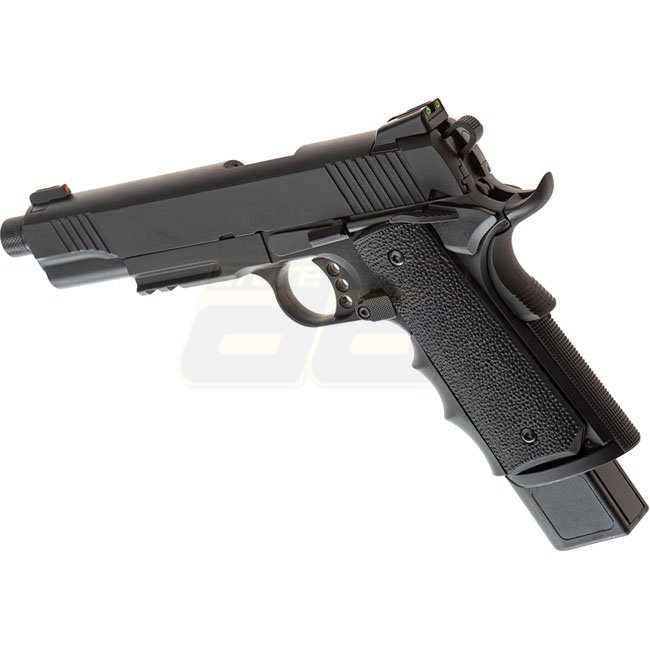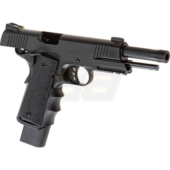 Army Armament M1911 Erweitertes Gas Blow Back Pistole in schwarzer Farbe. Metall/Polymer-Konstruktion, 26-Schuss Magazin, 235 mm Länge, 1100 g Gewicht, 110 mm Innenlauf, Schussgeschwindigkeit von 320-340 FPS. Semi-Auto-Modus mit einstellbarem Hop-Up. Das