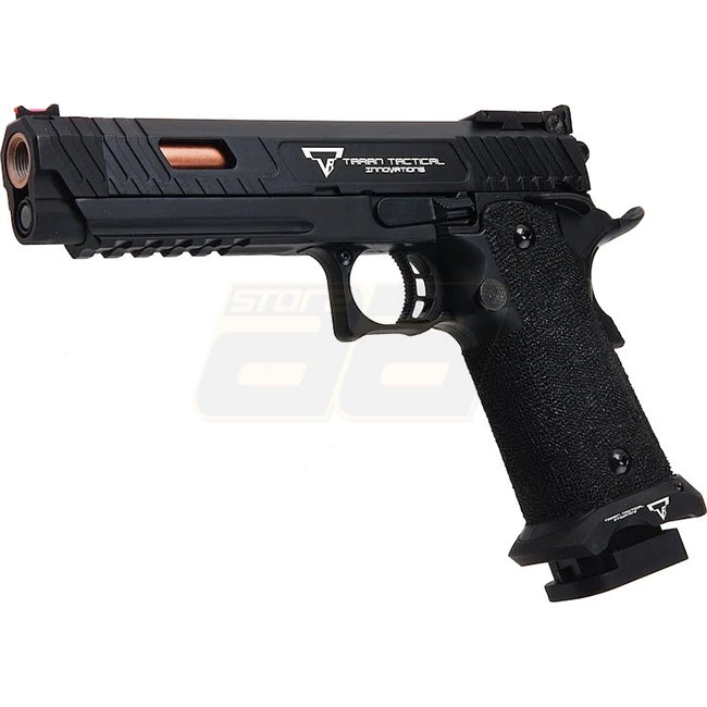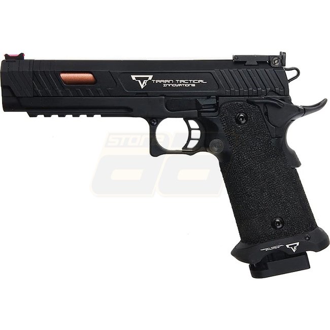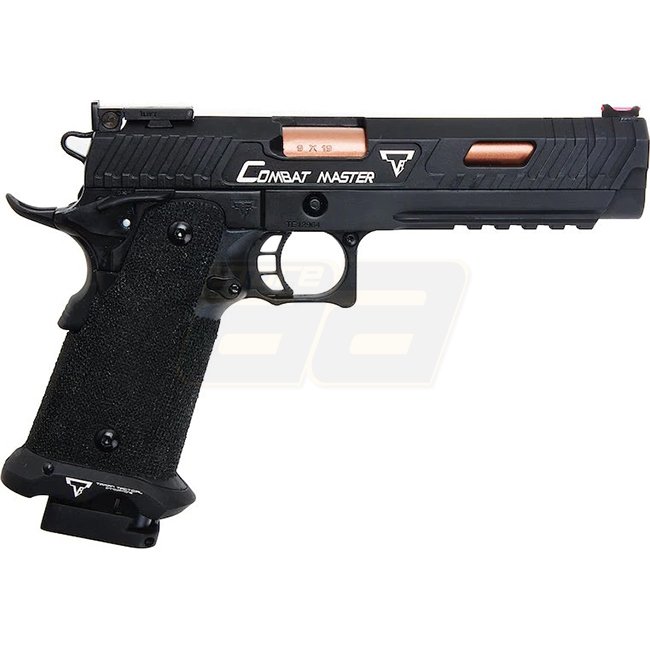 Hochwertige Army Armament TTI JW3 Combat Master Gas Blow Back Pistole in schwarzer Farbe mit Metall/Polymer-Konstruktion. Enthält ein 30-Schuss-Magazin, 265 mm Länge, 1060 g Gewicht, 110 mm Innenlauf, 300-320 FPS Mündungsenergie, Halbautomatischer Schussm