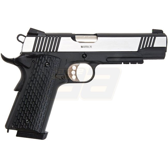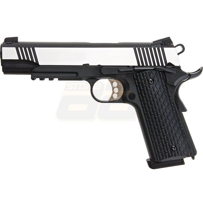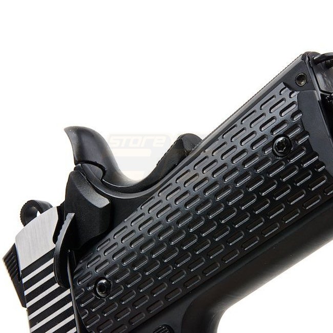 Erleben Sie realistische Schießerlebnisse mit der Army R28 Gas Blow Back Pistole in Schwarz/Silber. Metall-Schlitten und -Rahmen, 27-Schuss Magazin, 224 mm Länge, 910 g Gewicht, 119 mm Innelauf, 300-320 FPS und Halbautomatikmodus. Verstellbarer Hop-Up für