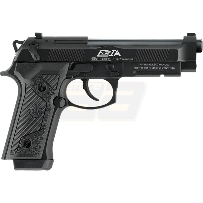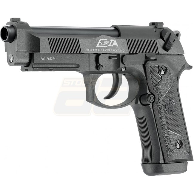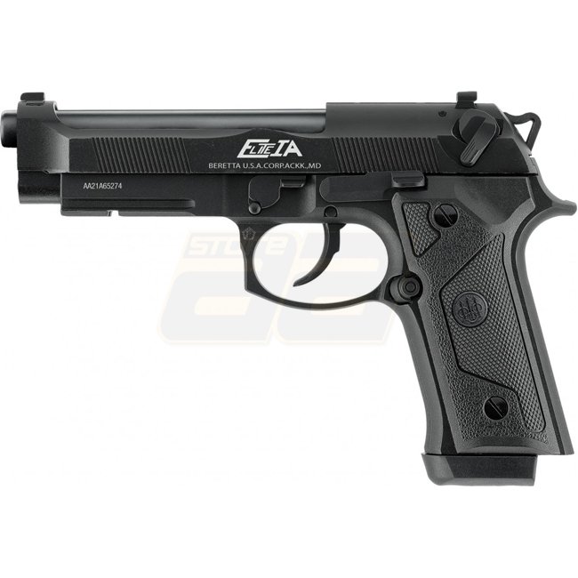Beretta Elite IA Gas Blow Back Pistole in schwarzer Farbe. Metall- und Polymerkonstruktion, 23-Schuss-Magazin, 210 mm Länge, 900 g Gewicht, 100 mm Innenlauf, 300-320 FPS Geschwindigkeit, halbautomatischer Schussmodus, 41,16-43,90 m Schussreichweite, verst