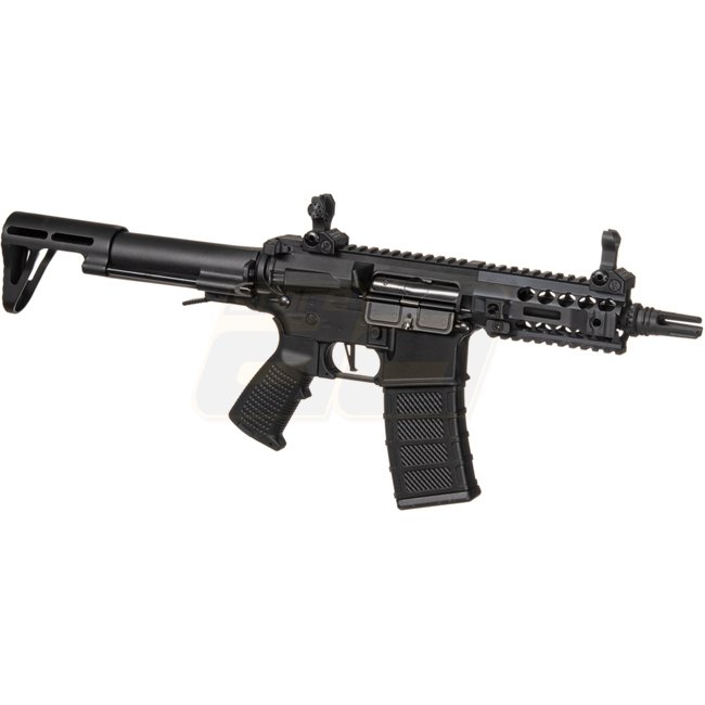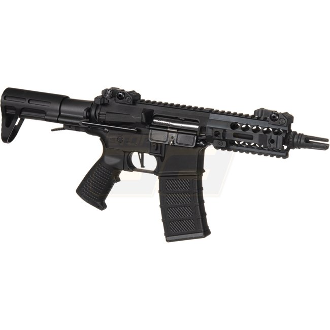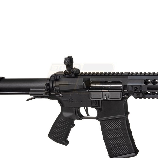 Hochwertige Classic Army AR-4 SBR AEG in elegantem schwarzen Farbton. Metallkonstruktion mit Polymer-Schaft und Pistolengriff. 300 Schuss Magazin Kapazität, 550-640 mm Länge und 1900 g Gewicht. Semi-Auto- und Vollautomatik-Schießmodi, 330-350 FPS Geschwin