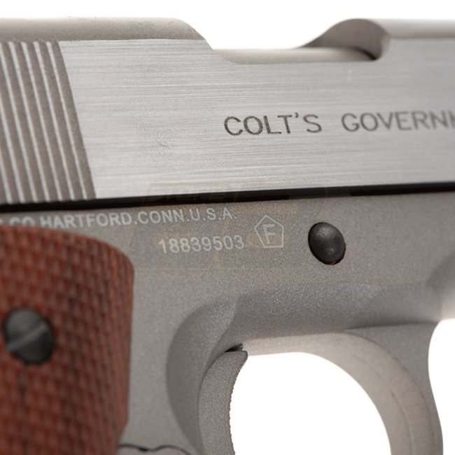 Colt MK IV Co2 Blow Back Pistole - Edelstahl ist eine Metallpistole mit Kunststoffgriff, Magazin Kapazität von 17 (6mm), 217mm Länge, 890g Gewicht, 110mm Innenlänge des Laufs, Mündungsenergie von 345-365 FPS / 1,11-1,24 Joule, halbautomatischer Schussmodu