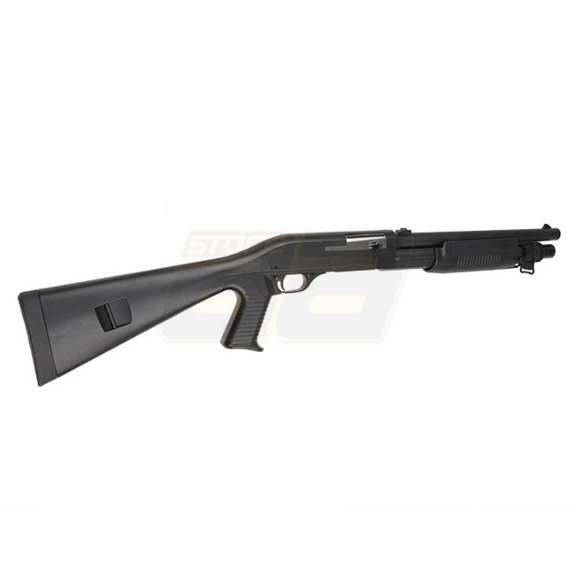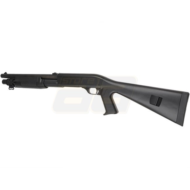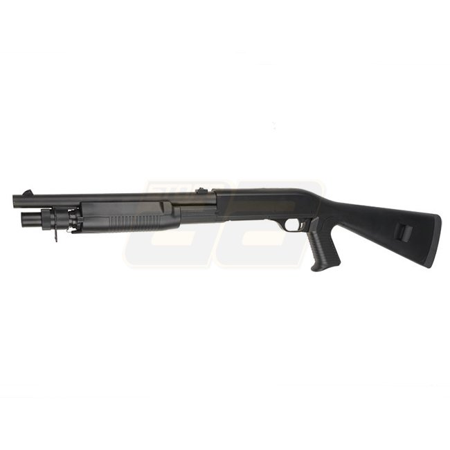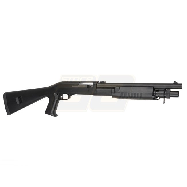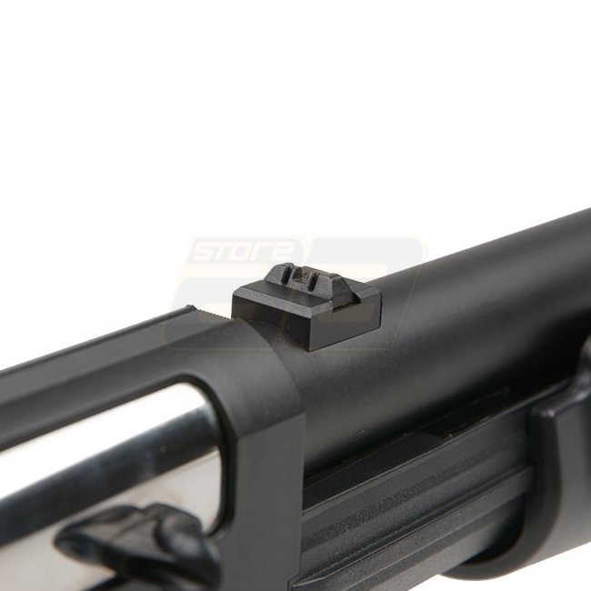 Die 3-Burst Shotgun Serie von Cyma verfügt über drei Läufe womit pro Schuss jeweils 3 BBs verschossen werden die nach ein paar Meter streuen und somit eine grössere Fläche abdecken – wie man es sich eben bei einer Shotgun wünscht. Die mitgelieferte Hülse verfügt über eine Kapazität von 10 Schuss bzw. 30 BBs und wird wie ein Magazin eingelegt, die Hülse wird beim Schiessen nicht ausgeworfen. Dies macht die Schrotflinte zwar etwas weniger realitätsnah, dafür müssen die Hülsen nicht mühsam zusammengesucht werden. Zusätzliche Hülsen sind separat erhältlich.