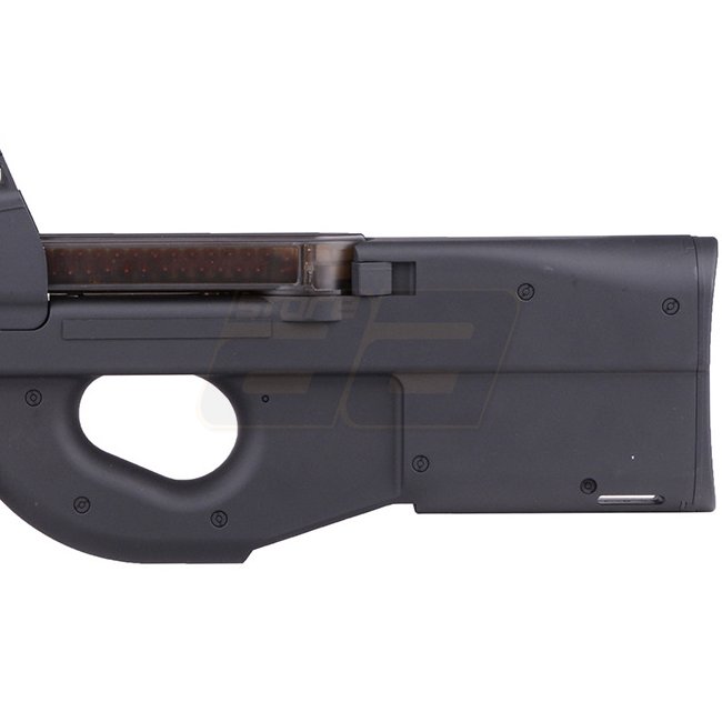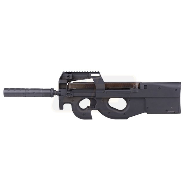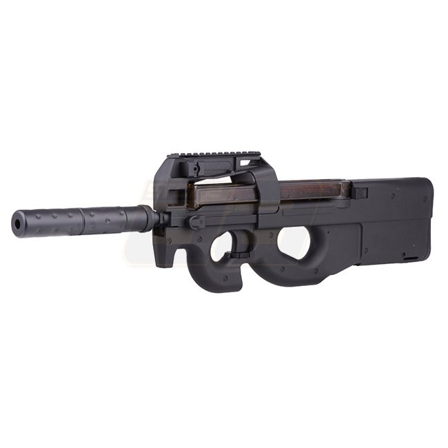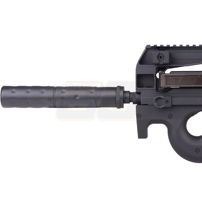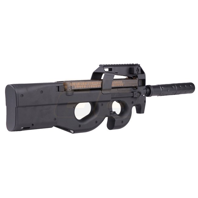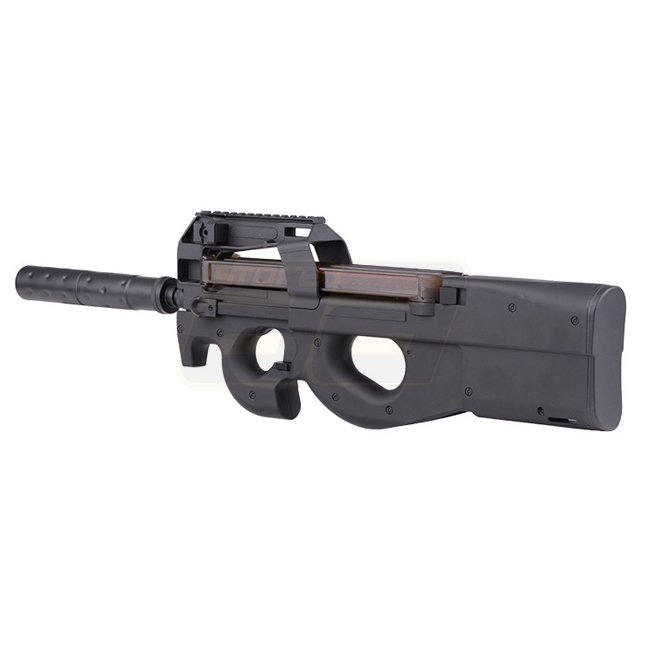 Diese P90 Variante verfügt ab Werk über eine 20mm Schienen für das Anbringen einer Zielhilfe. Der mitgelieferte Schalldämpfer lässt sich abnehmen und durch einen Feuerscheindämpfer ersetzen (separat erhältlich).