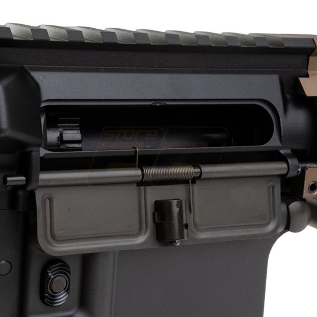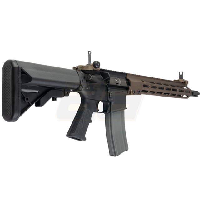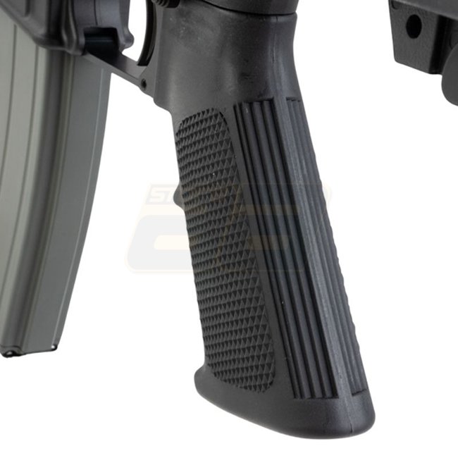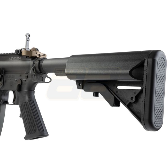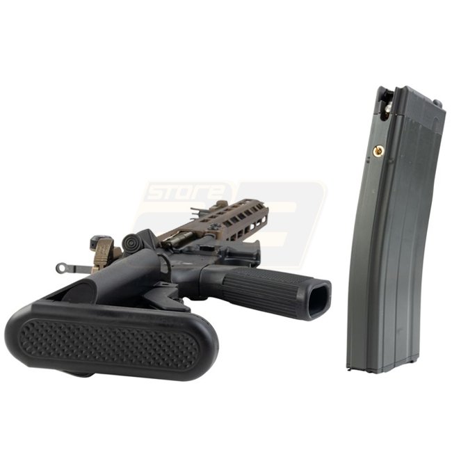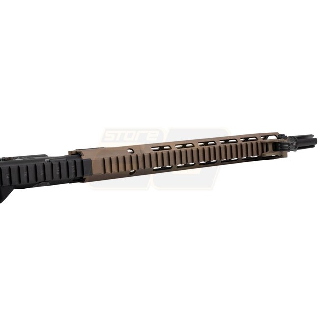 Gas-Blow-Back-Replika des URGI (Upper Receiver Group Improved) mit 14.5-Zoll-Lauf, basierend auf der von US-Spezialeinheiten eingesetzten Konfiguration für Mid- bis Longrange-Einsätze. Das Modell orientiert sich an der NSW-Version mit verlängertem M-Lok-Handschutz, flachem Gasblock und Geissele-Style-Designmerkmalen.