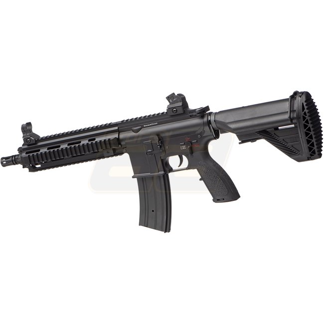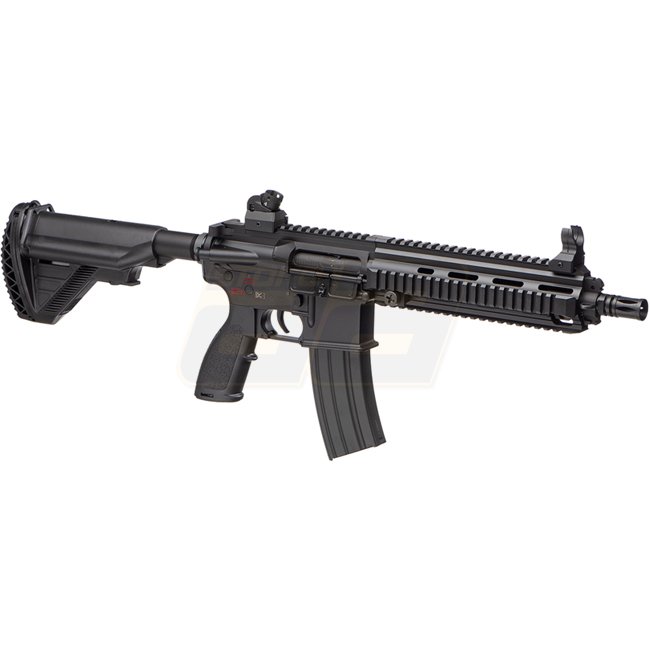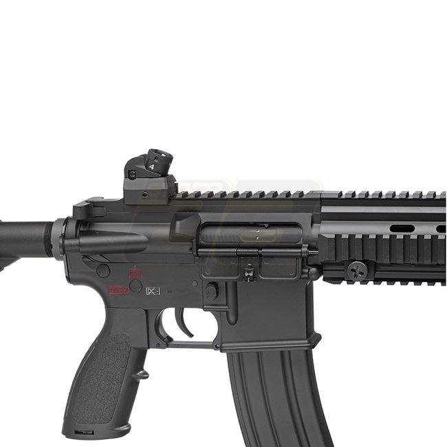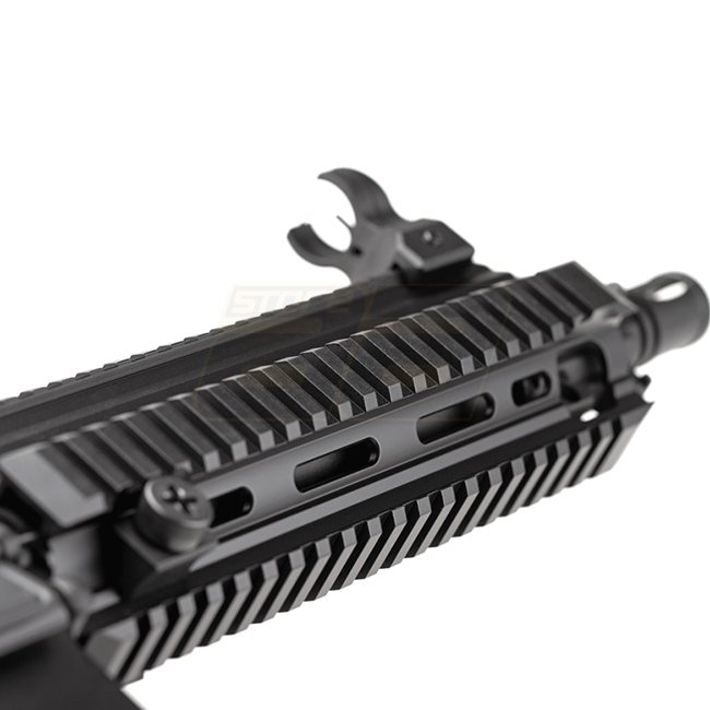 Dieses E&C EC-102 QR 1.0 EGV S-AEG in Schwarz ist für den deutschen Markt konzipiert und bietet nur halbautomatisches Schießen. Offiziell genehmigt vom Besuchssamt, enthält es das F im Pentagonzeichen. Merkmale sind eine Metallkonstruktion mit Polymer-Sch