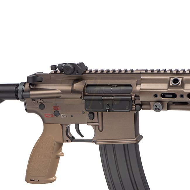 E&C SOPMOD 14.5 Zoll QR 1.0 EGV AEG - Dark Earth ist eine hochwertiger Airsoft-Waffe mit einem Metallgetriebe, Motor vom langen Typ und einer Magazinkapazität von 300 (6mm). Sie hat eine Länge von 840-925mm und ein Gewicht von 3400g, mit einer Mündungsges
