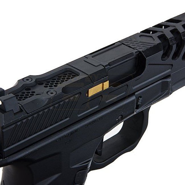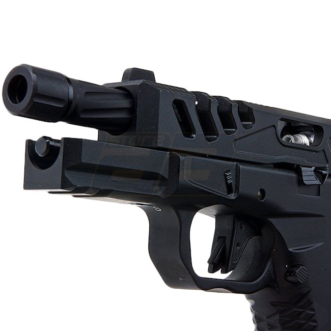 Die EMG F1 Gas Blow Back Pistole in Schwarz ist eine hochwertige Metallpistole mit einer Magazin kapazität von 23 Patronen. Mit einer Länge von 235mm und einem Gewicht von 655g verfügt diese Pistole über den Schussmodus Semi Auto und eine Schussreichweite