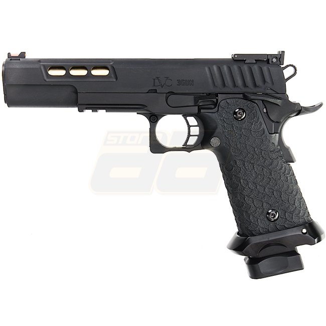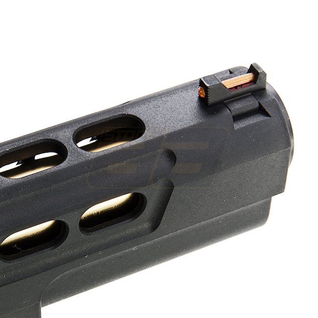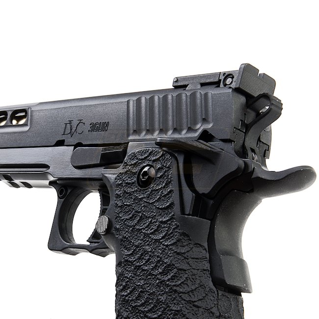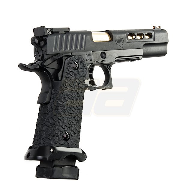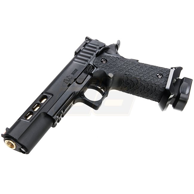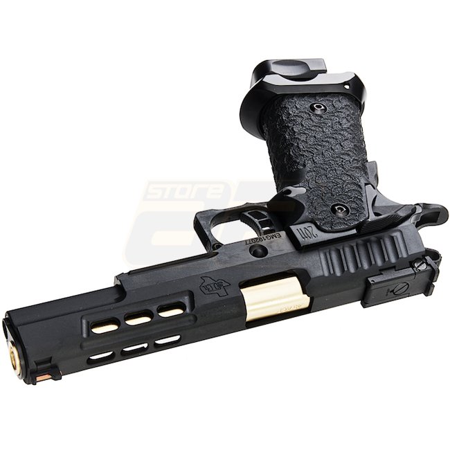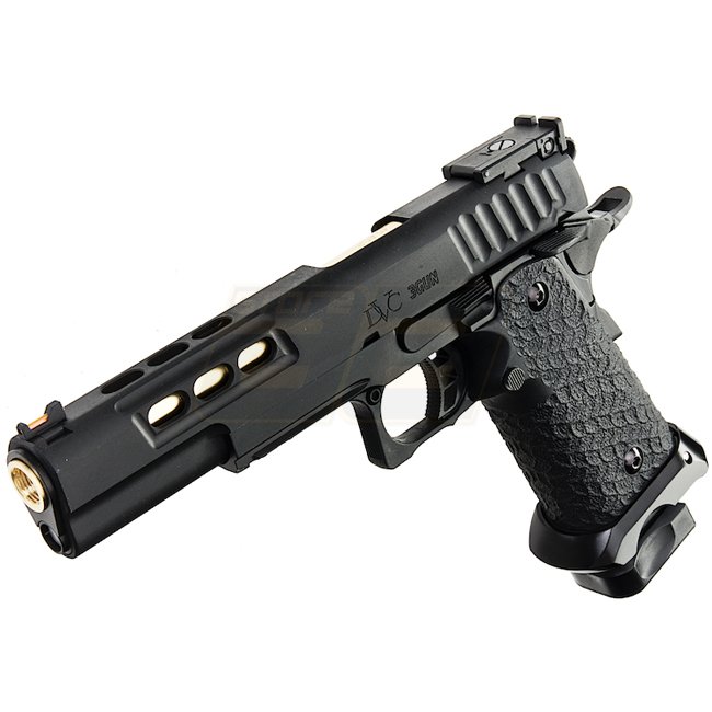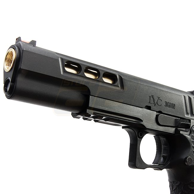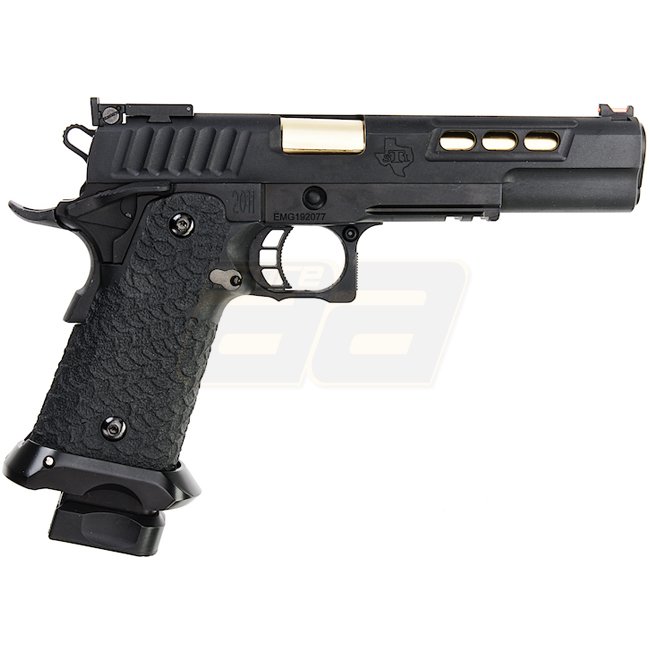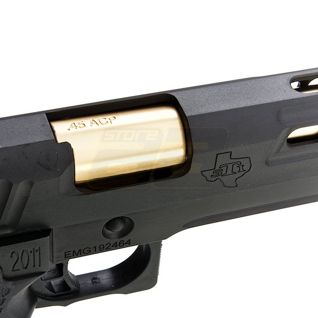 EMG STI DVC 3-GUN 2011 Gas Blow Back Pistole in Schwarz mit Metall-Schlitten und -Rahmen, Kunststoffgriff, 28 Schuss Magazin, Schießen im halbautomatischen Modus mit verstellbarem Hop-Up. Im Lieferumfang sind Waffe und Magazin enthalten. Länge: 230mm, Gew