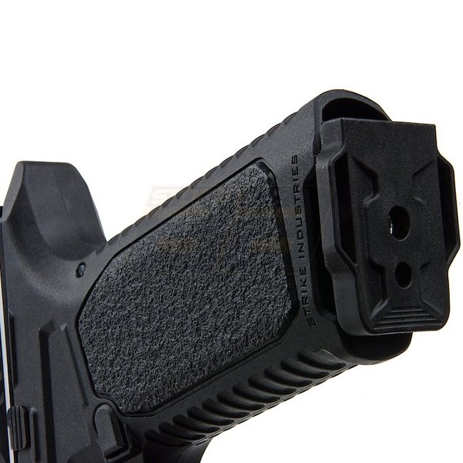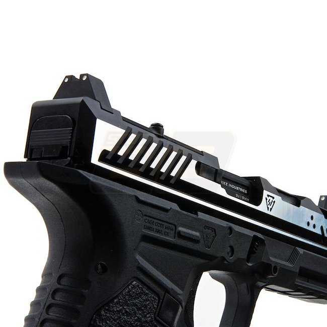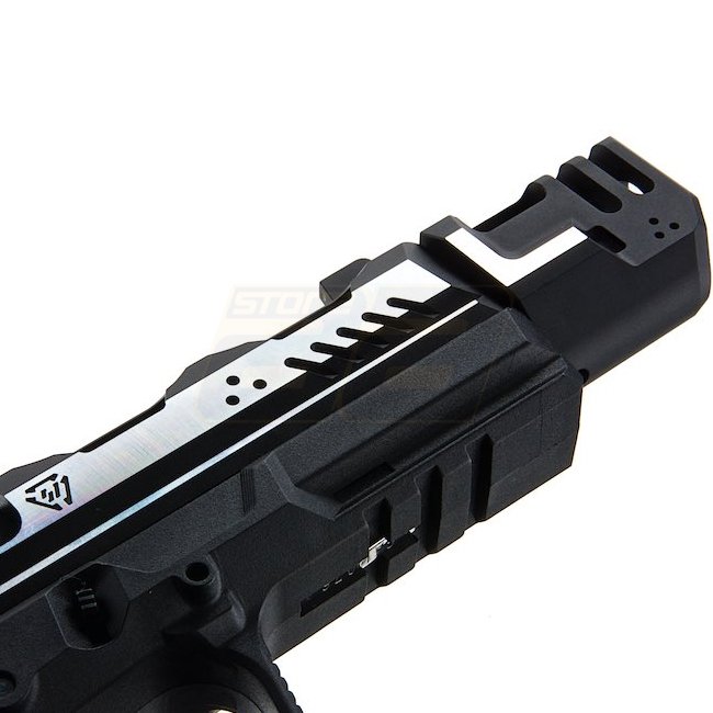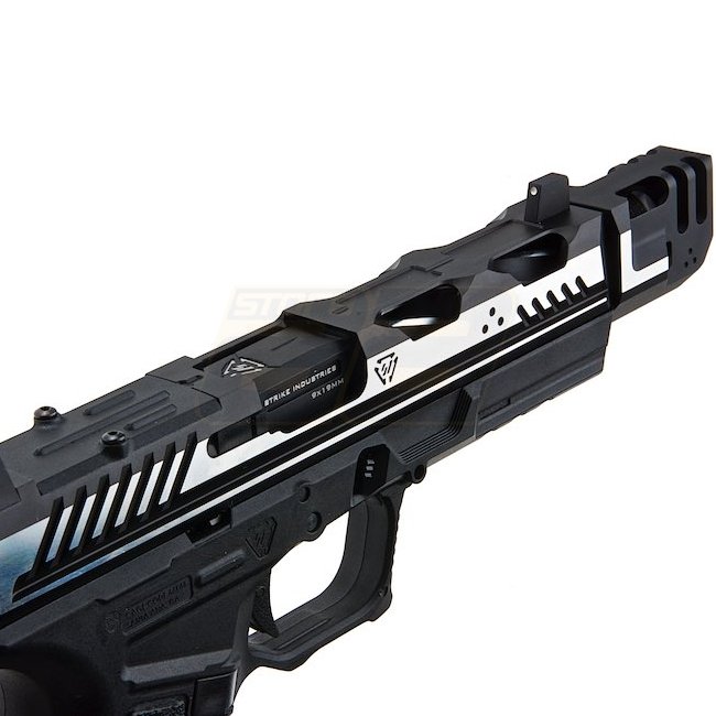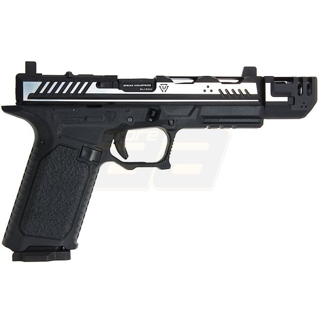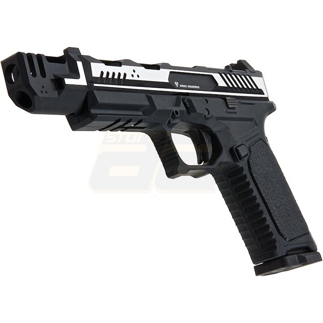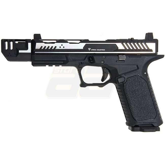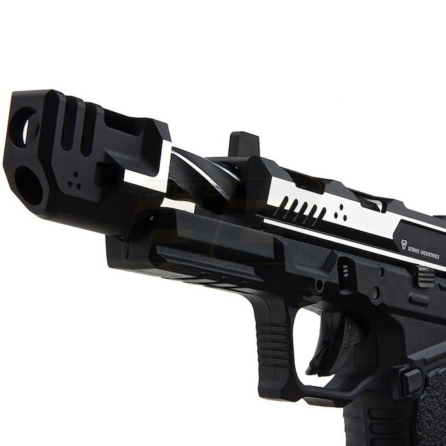 Hochwertige EMG Strike Industries ARK-17 Comp Gas Blow Back Pistole in Schwarz/Silber. Vollständig lizenziert von Strike Industries mit Aluminium CNC Außengehäuse & Schlitten, Kompensator, anodische Oxidationsoberflächenbehandlung, RMR Rotpunkt bereit. Ko
