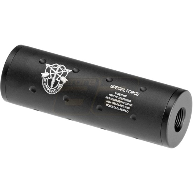 FMA Special Forces Schalldämpfer in elegantem Schwarz. Metallkonstruktion mit einem Durchmesser von 35 mm und einer Länge von 110 mm. Ausgestattet mit einem 14mm- / CCW- und einem 14mm+ / CW-Gewinde. Verbessern Sie Ihre Ausrüstung mit diesem taktischen Zu