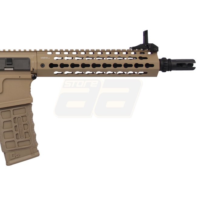 Die CM16 SR Modelle gibt es in drei unterschiedlichen Längen: S, L und XL. Alle drei Versionen sind mit einem schlanken Handschutz ausgestattet, welcher über das KeyMod System zur Montage von Schienen und Zubehör verfügt. Kimme und Korn sind klappbar und können bei Bedarf durch den Anwender auch ganz abgenommen werden da schraubbar. Beim Schaft kommt ein neues Modell mit dicker Gummi Abdeckung am Ende sowie ausklappbarem Batteriefach zur Anwendung. Er lässt sich einhändig in sechs Stufen verstellen und in der jeweiligen Position fest durch einen Hebel arretieren. Der Pistolengriff ist äusserst ergonomisch und stellt durch die Fingermulden sowie die nach hinten hochgezogene Bauweise einen optimalen Halt sicher. Die ab Werk verbaute Riemenöse findet sich hier leider nur auf der Linken Seite womit die SR-Modelle eher für Rechtshänder ausgelegt sind – obschon der Magazinauswurf auf beiden Seiten angebracht wäre. Das spezielle Magazin ist sehr griffig und lässt sich dadurch auch in hektischen Situationen gut aus einer Westentasche ziehen und einsetzen. Beim Gehäuse hat sich G&G ein modernes Design einfallen lassen welches sich klar von herkömmlichen M4 Bodies unterscheidet und dadurch der SR-Serie eine sehr spezielle Optik verleiht.