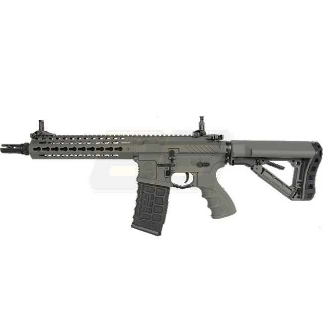 Die CM16 SR Modelle gibt es in drei unterschiedlichen Längen: S, L und XL. Alle drei Versionen sind mit einem schlanken Handschutz ausgestattet, welcher über das KeyMod System zur Montage von Schienen und Zubehör verfügt. Kimme und Korn sind klappbar und können bei Bedarf durch den Anwender auch ganz abgenommen werden da schraubbar. Beim Schaft kommt ein neues Modell mit dicker Gummi Abdeckung am Ende sowie ausklappbarem Batteriefach zur Anwendung. Er lässt sich einhändig in sechs Stufen verstellen und in der jeweiligen Position fest durch einen Hebel arretieren. Der Pistolengriff ist äusserst ergonomisch und stellt durch die Fingermulden sowie die nach hinten hochgezogene Bauweise einen optimalen Halt sicher. Die ab Werk verbaute Riemenöse findet sich hier leider nur auf der Linken Seite womit die SR-Modelle eher für Rechtshänder ausgelegt sind – obschon der Magazinauswurf auf beiden Seiten angebracht wäre. Das spezielle Magazin ist sehr griffig und lässt sich dadurch auch in hektischen Situationen gut aus einer Westentasche ziehen und einsetzen. Beim Gehäuse hat sich G&G ein modernes Design einfallen lassen welches sich klar von herkömmlichen M4 Bodies unterscheidet und dadurch der SR-Serie eine sehr spezielle Optik verleiht.