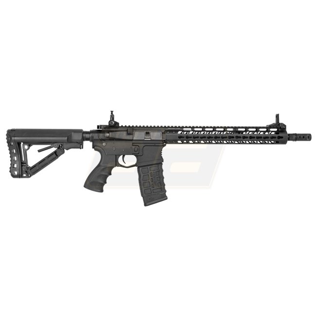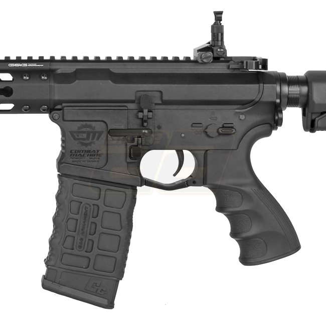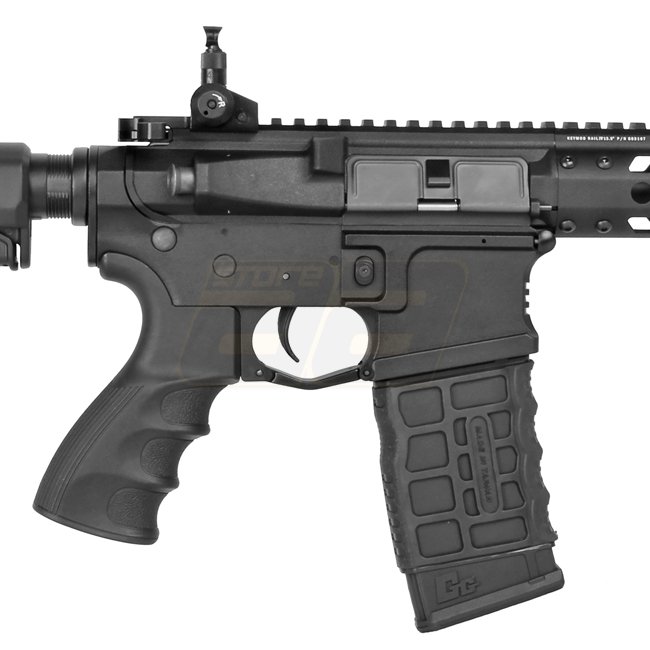 Die CM16 WILD HOG Modelle gibt es in vier unterschiedlichen Längen: 7, 9, 12 und 13.5 Inch. Alle drei Versionen sind mit einem schlanken Handschutz ausgestattet, welcher über das KeyMod System zur Montage von Schienen und Zubehör verfügt. Kimme und Korn sind klappbar und können bei Bedarf durch den Anwender auch ganz abgenommen werden da schraubbar. Beim Schaft kommt ein neues Modell mit dicker Gummi Abdeckung am Ende sowie ausklappbarem Batteriefach zur Anwendung. Er lässt sich einhändig in sechs Stufen verstellen und in der jeweiligen Position fest durch einen Hebel arretieren. Der Pistolengriff ist äusserst ergonomisch und stellt durch die Fingermulden sowie die nach hinten hochgezogene Bauweise einen optimalen Halt sicher. Die ab Werk verbaute Riemenöse findet sich hier beidseitig – gleiches gilt für den Magazinauswurf sowie den Feuerwahlhebel - womit die WILD HOG-Modelle auch für Linkshänder ausgelegt sind. Das spezielle Magazin ist sehr griffig und lässt sich dadurch auch in hektischen Situationen gut aus einer Westentasche ziehen und einsetzen. Beim Gehäuse hat sich G&G ein modernes Design einfallen lassen welches sich klar von herkömmlichen M4 Bodies unterscheidet und dadurch der WILD HOG-Serie eine sehr spezielle Optik verleiht.
