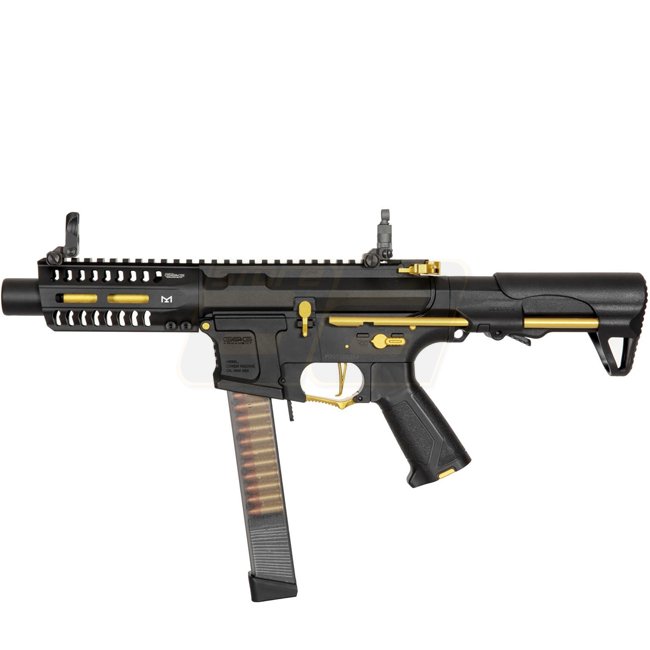 G&G ARP 9 Stealth AEG - Gold ist eine leistungsstarke und vielseitige Airsoft-Waffe mit einem eleganten Design. Sie verfügt über einen Langmotor, verstellbaren Hop-Up und eine Magazinaufnahme von 60 Schuss. Ideal für sowohl halbautomatische als auch volla