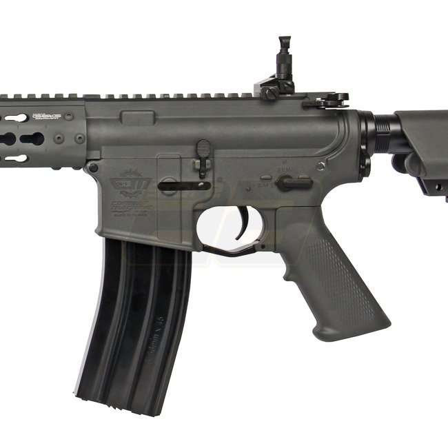 G&G CM15 KR-APR 14,5 Zoll AEG - Grau. Gearbox: Version 2, Motor: Langtyp, Material: ABS-Kunststoff / Metallzubehör. Magazinkapazität: 450 (6mm), Länge: 900-990 mm, Gewicht: 2400 g. Mündungsgwinde: 14mm- / CCW, Mündungsenergie: 360-380 FPS / 1,20-1,34 Jou