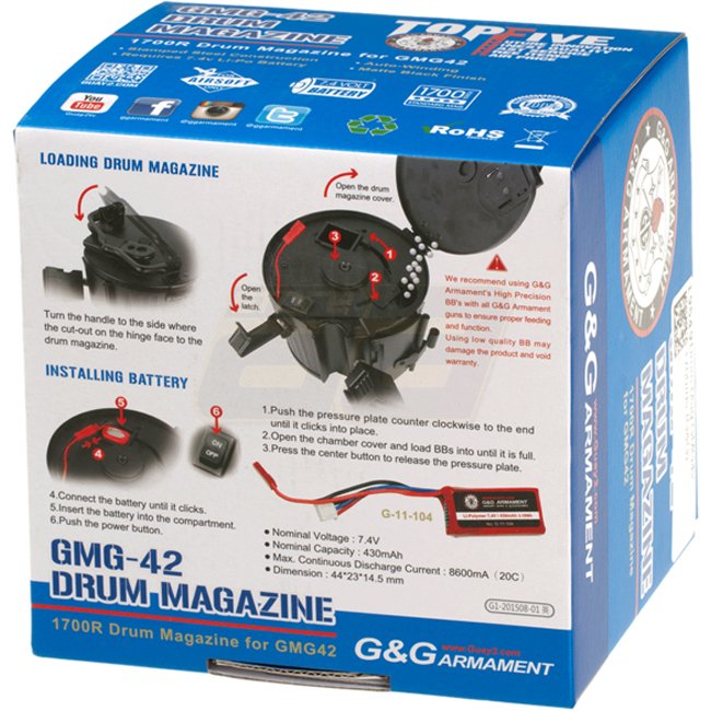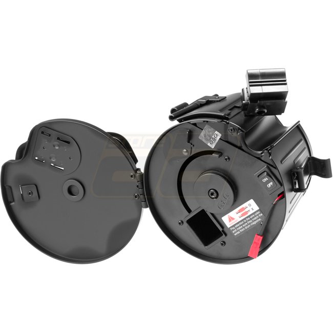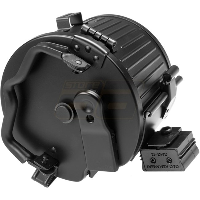 G&G GMG42 1700rds Box-Magazin in schwarzer Farbe ist ein Hochkapazitätsmagazin, das für erhöhte Feuerkraft und verlängerte Gefechte entwickelt wurde. Seine robuste Bauweise gewährleistet zuverlässige Leistung und einfaches Nachladen, was es zu einem unver