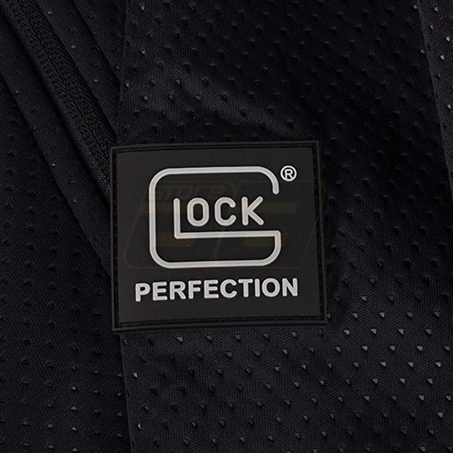 • Design: Schwarze Softshell mit grauem GLOCK Perfection Gummi-Logoabzeichen am Ärmel