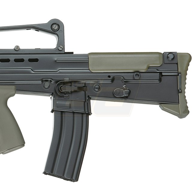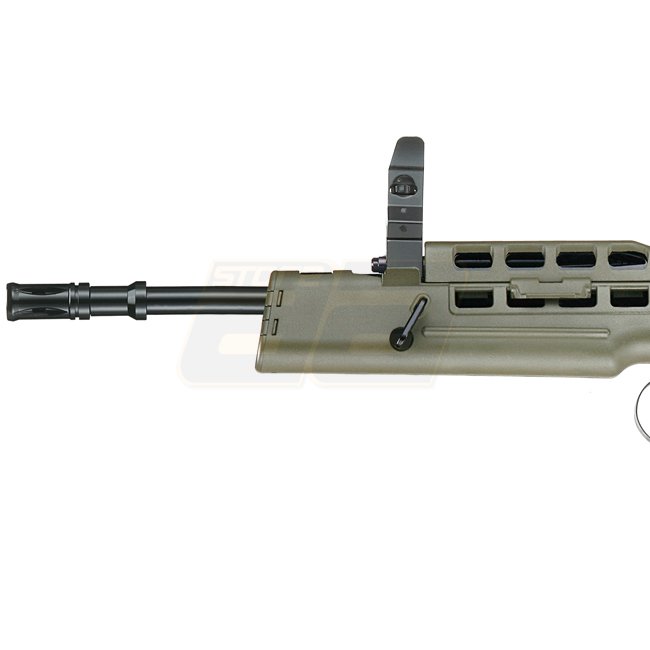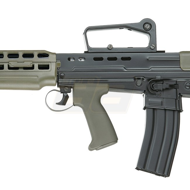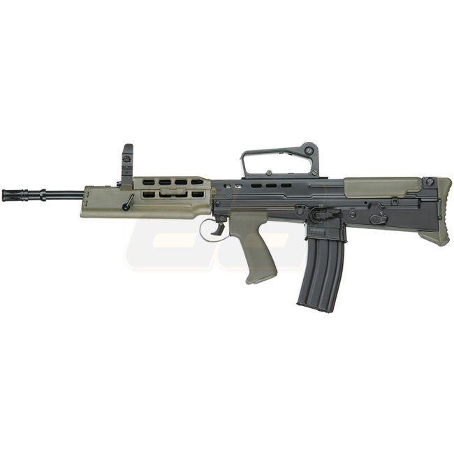 ICS bringt mit der britischen L85/L86 Serie sehr schön verarbeitete und äusserst robuste Modelle aus Stahl auf den Markt. Der Handschutz kann ganz einfach geöffnet werden und nimmt die Batterie auf. Spezielle ist neben dem sogenannten Bullpup System und dem damit einhergehenden langen Lauf auch das Feder-Schnellwechselsystem. Die Feder kann mit wenigen Handgriffen ausgewechselt werden, die Gearbox muss dafür nicht geöffnet werden. Zudem verfügt der Springguide über drei seitliche Bohrungen damit dieser in verschiedenen Positionen arretiert werden kann. Damit erzielt man mit der gleichen Feder drei unterschiedliche FPS Werte (Leistung), einfach und schnell einstellbar für den Anwender. Wie bei den L85/L86 üblich weisen diese keine Standard 20mm/Picatinny Schiene auf womit keine herkömmlichen Zielhilfen montiert werden können. Hierfür gibt es das spezielle SUSAT Zielfernrohr mit vierfach Vergrösserung.