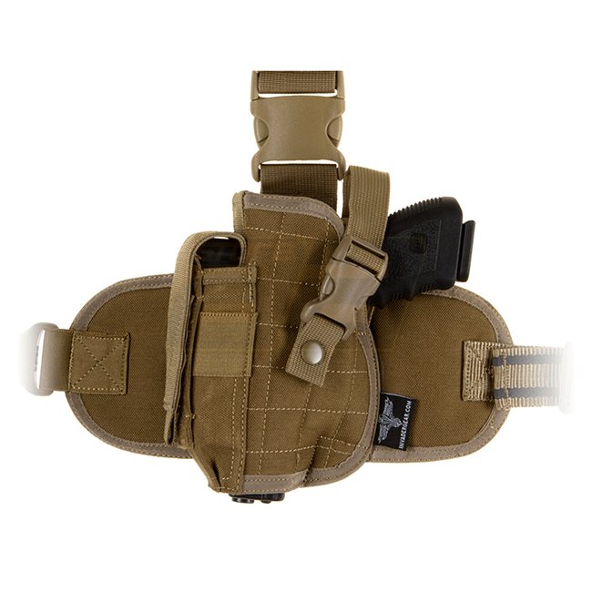 Universelles Dropleg-Holster, das für eine Vielzahl von mittelgrossen Pistolen wie z.B. Glock 17 oder Beretta 92 geeignet ist. Es ist mit einer integrierten Magazintasche und einer Beinplatte ausgestattet, welche mit einem Gürtelclip und drei rutschfesten elastischen Bändern am Oberschenkel befestigt wird.
