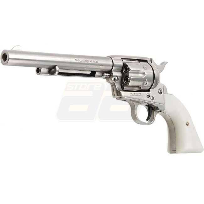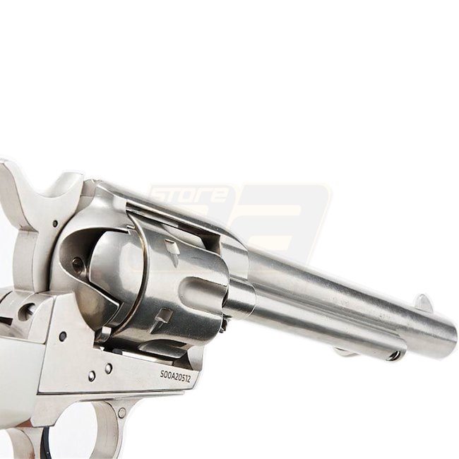 Hochwertiger King Arms SAA .45 Peacemaker Gasrevolver M in elegantem silbernem Finish. Metall- und Polymerkonstruktion, 6 mm Magazin Kapazität. Semi-Auto-Schussmodus, feste Hop-Up. Enthält 6x Hülsen. Länge: 310 mm, Gewicht: 1016 g. Innenlänge des Laufs: 2