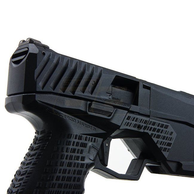 Krytac SilencerCo Maxim 9 Co2 Blow Back Pistole - Schwarz: Metall- und Polymerkonstruktion, 24-Schuss Magazin, 275 mm Länge, 920 g Gewicht, 350-370 FPS Geschwindigkeit, Halbautomatik- und Vollautomatik-Modi, 48,02-50,76 m Reichweite, verstellbarer Hop-Up.