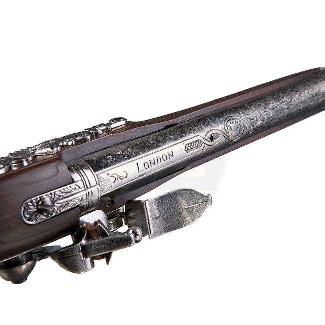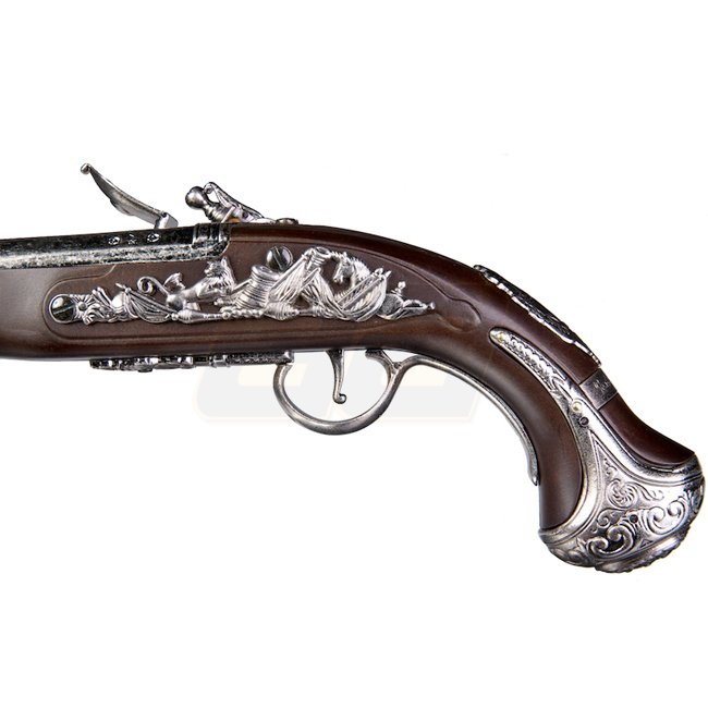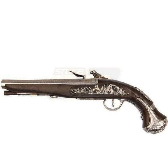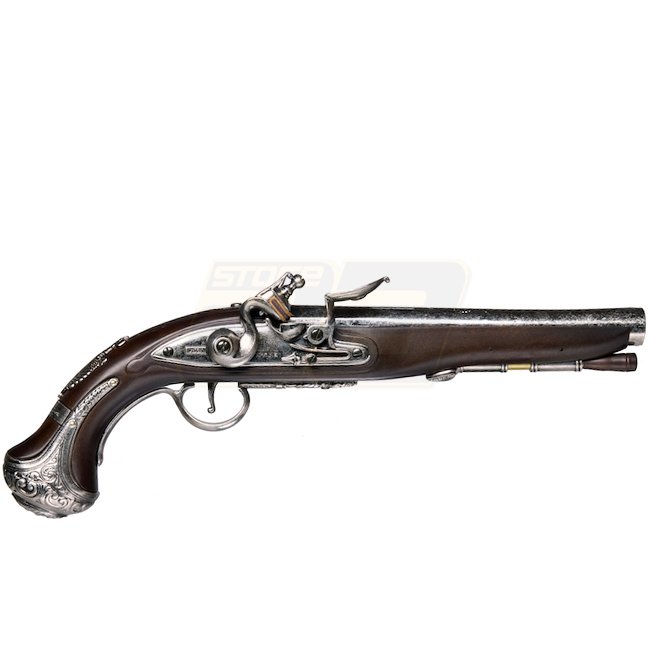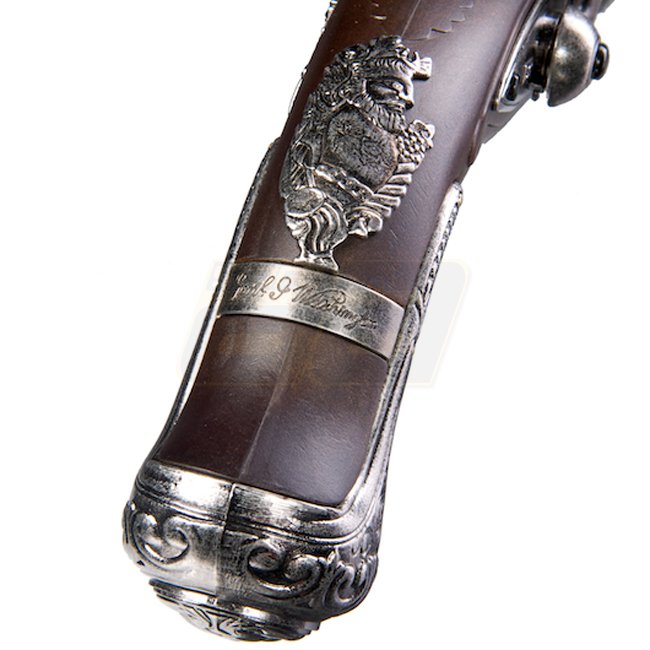 Eine Nachbildung der ikonischen KTW G. Washington Flintlock Federpistole, diese Metall- und Kunststoff-Stock Airsoft-Pistole verfügt über eine Magazin Kapazität von 12 Schuss, eine Länge von 363mm und ein Gewicht von 740g. Mit einer Innenlauf Länge von 12