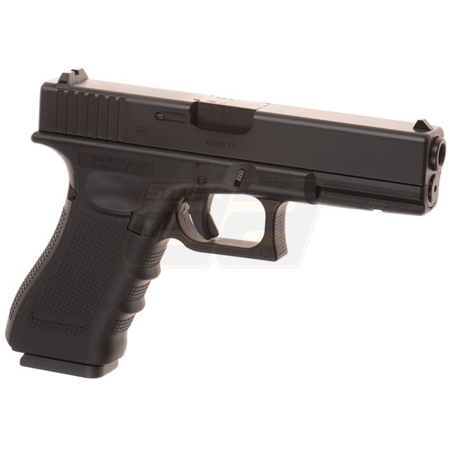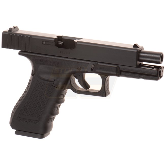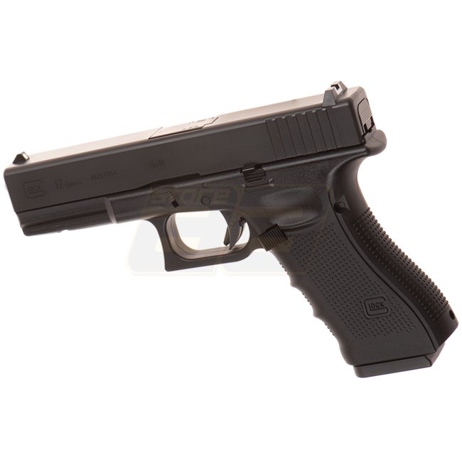 KWC Glock 17 Gen 4 Co2 Blow Back Pistole - Metallverschluss / Kunststoffgriff & -rahmen, 23 Schuss Magazin, 202 mm Länge, 665 g Gewicht, 97 mm Innenlauflänge, 310-330 FPS Mündungsgeschwindigkeit. Halbautomatischer Schießmodus mit einstellbarem Hop-Up. Im