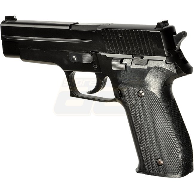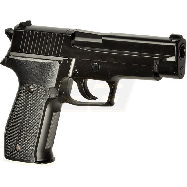 KWC P226 Federpistole - Schwarz, ABS-Kunststoff und Metallkonstruktion, 12-Schuss-Magazin, 195 mm Länge, 310 g Gewicht, 220-240 FPS Mündungsvelocity, Schussreichweite zwischen 45,27-48,02 m, festes Hop-Up. Das Paket enthält die Waffe und das Magazin.