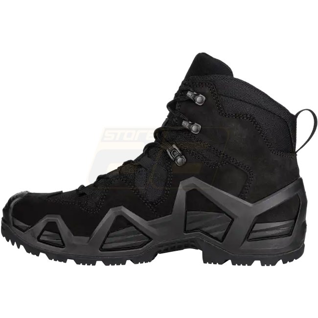 Der Lowa Zephyr Mk2 GTX Mid TF in Schwarz, UK-Größe 6,5, verfügt über eine Spritzgusskonstruktion mit einer Schafthöhe von 145 mm (außen) und 110 mm (innen). Gummisohle, Polyurethan-Zwischensohle, Gore-Tex-Futter, wiegt 1140 g. Perfekt für Abenteuer im Fr