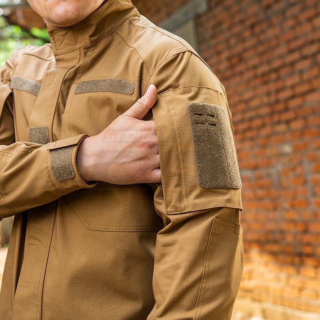 Die M-Tac Patrol Flex Jacke in Coyote-Farbe ist ein bequemer, leicht taillierter Mantel mit Stehkragen, Reißverschluss, versteckten Brusttaschen und Belüftungsösen. Sie verfügt über Klettflächen für Namensschilder, eine Rückenpasse für einen IR-Marker und