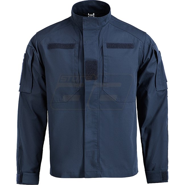 Die M-Tac Patrol Flex Jacke in Dunkelmarineblau bietet einen bequemen, leicht taillierten Schnitt mit Merkmalen wie einem Stehkragen, Zentralreißverschluss, versteckten Taschen und Belüftungsösen. Die Jacke umfasst auch Klettflächen für Patches, Ellbogent