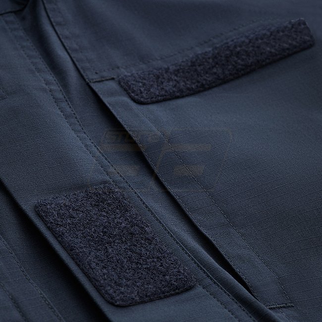 Die M-Tac Patrol Flex Jacke in Dunkelmarineblau bietet einen bequemen, leicht angepassten Schnitt mit Merkmalen wie einem Stehkragen, zentralem Reißverschluss, versteckten Taschen, Klettflächen, Achselösen für Belüftung, verstärktem Schulterbereich, erwei