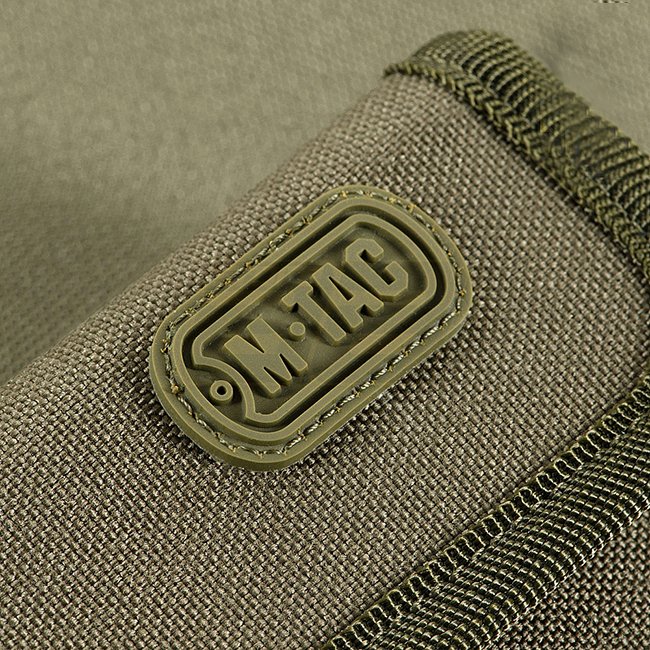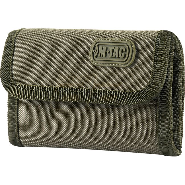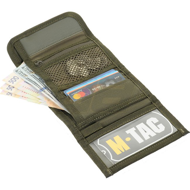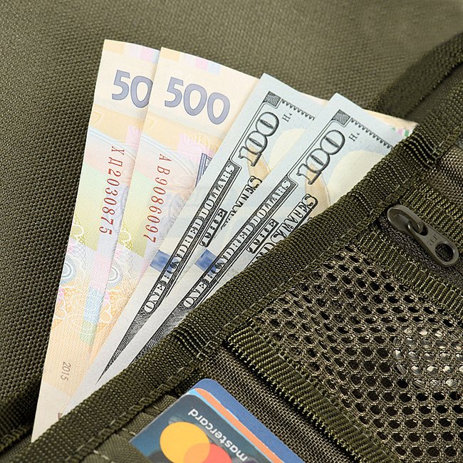 Es hat zwei große Fächer für Geldscheine, Fächer für Karten und Kunststofffächer für Dokumente. Es gibt auch eine Kleingeldtasche, die mit einem Reißverschluss geschlossen wird. Auf der Vorderseite mit Klett können Sie verschiedene Patches anbringen.