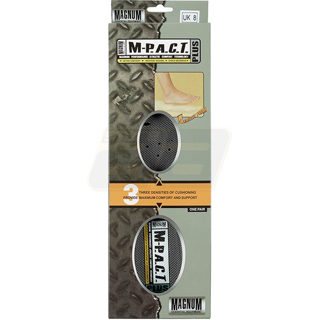 Verbessern Sie Ihre Schuhe mit der Magnum M-P.A.C.T. Plus Einlegesohle - 45! Leichte Komfortsohle mit Memory-Schaum und rutschfesten Pads. Stoßdämpfend, atmungsaktiv und bietet optimale Belüftung. Ein Muss für alle Arten von Schuhen und Stiefeln.