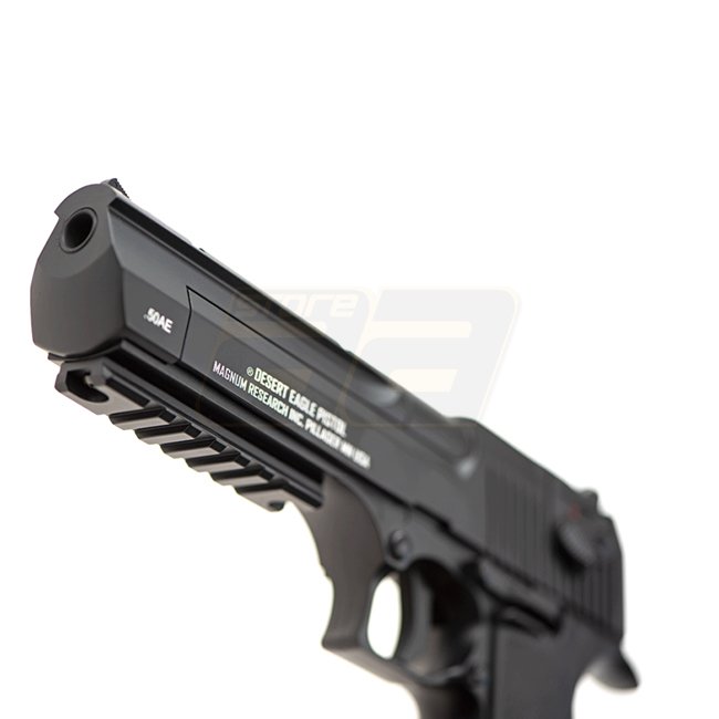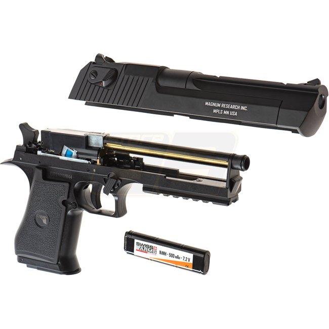 Kraftvoll und vielseitig, die Magnum Research Desert Eagle .50 AE AEP ist eine Kunststoff-Airsoftwaffe mit Halbautomatik- und Vollautomatik-Schussmodi. Sie verfügt über eine Magazinkapazität von 30 Schuss, eine Länge von 270 mm und ein verstellbares Hop-U