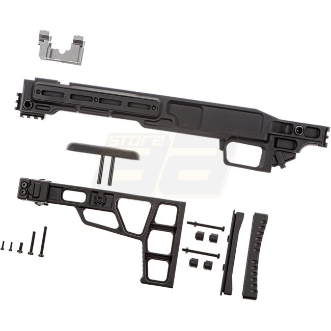 Rüsten Sie Ihr VSR-10 Scharfschützengewehr mit dem Maple Leaf MLC-S2 Taktischen Klappchassis in elegantem Schwarz auf. Verbessern Sie Ihre Schießgenauigkeit und Präzision mit diesem langlebigen und stilvollen Zubehör.