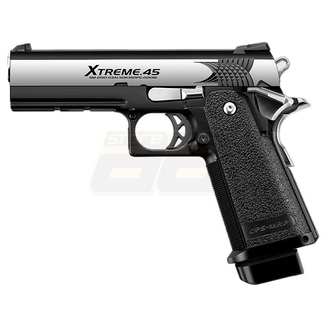 Die Xtreme Full Auto in der kurzen 4.3 Ausführung stammt wie alle Hi-Capa Pistolen von den 1911 Modellen ab. Neben den offensichtlichen optischen Änderungen wie dem Absehen, dem modernen Abzug und Hammer sowie der beidseitigen Sicherung, weist die Hi-Capa Serie ein sogenanntes Double Stack Magazin auf: Die Munition wird doppelreihig eingelegt was zu einem breiteren Griffstück aber auch zu einer höhen Kapazität führt. Mit 31 Schuss ist die Pistole denn auch im oberen Kapazitäts-Bereich angesiedelt und dies ist auch nötig: Dieses Modell schiesst ausschliesslich vollautomatisch. Wie üblich bei den 1911 Pistolen findet sich auch hier eine zusätzliche Handballensicherung im Griffstück. Die Schiene unter dem Lauf kann diverses Zubehör wie Lampen aufnehmen.