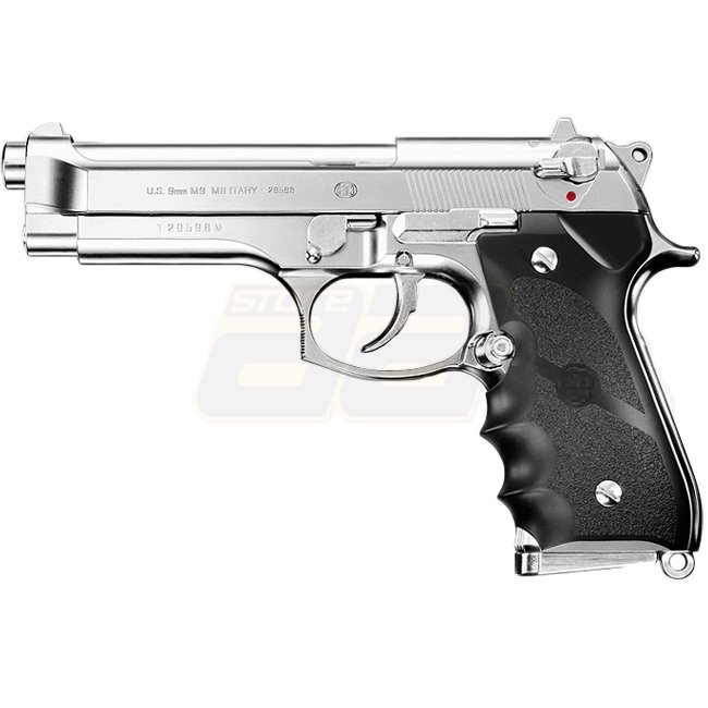 Marui M92FS Chrome Edelstahl GBB - ABS-Kunststoffmaterial, 26-Schuss-Magazin, 216mm Länge, 740g Gewicht, 125mm Innenlauf, 280-300 FPS Geschwindigkeit, Halbautomatikmodus, 38,41-41,16m Schussweite, Fest Hop Up. Das Paket enthält die Waffe und das Magazin.