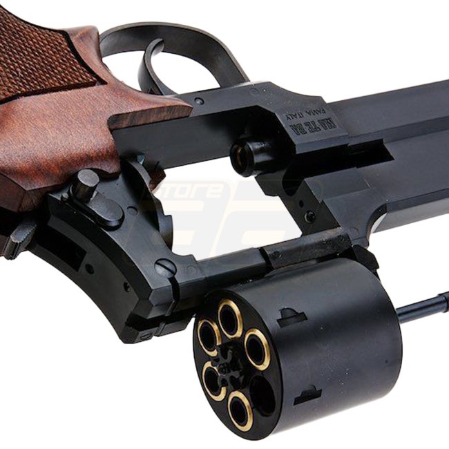 Dieser matte Marushin Mateba Gasrevolver verfügt über einen 4 Zoll schweren Holzgriff in schwarz. Perfekt für Nutzer, die eine robuste und stylische Airsoft-Waffe suchen.