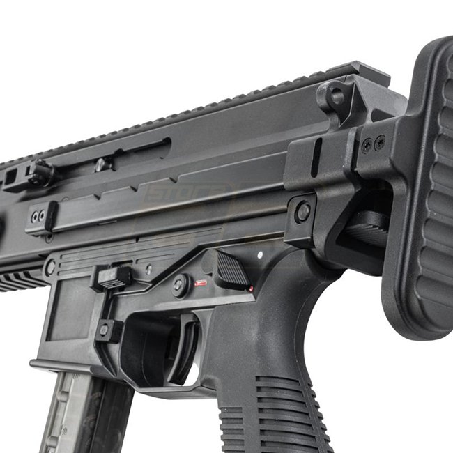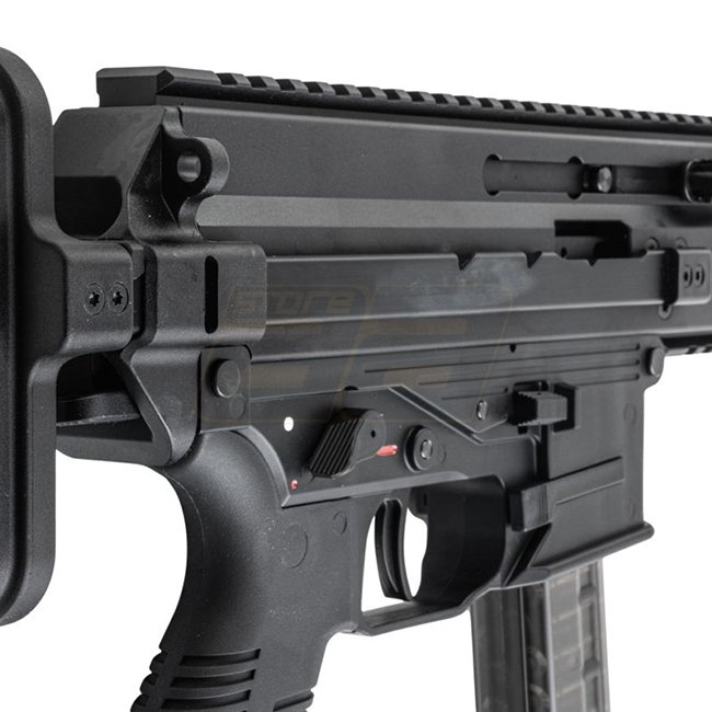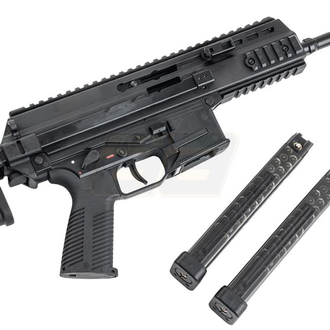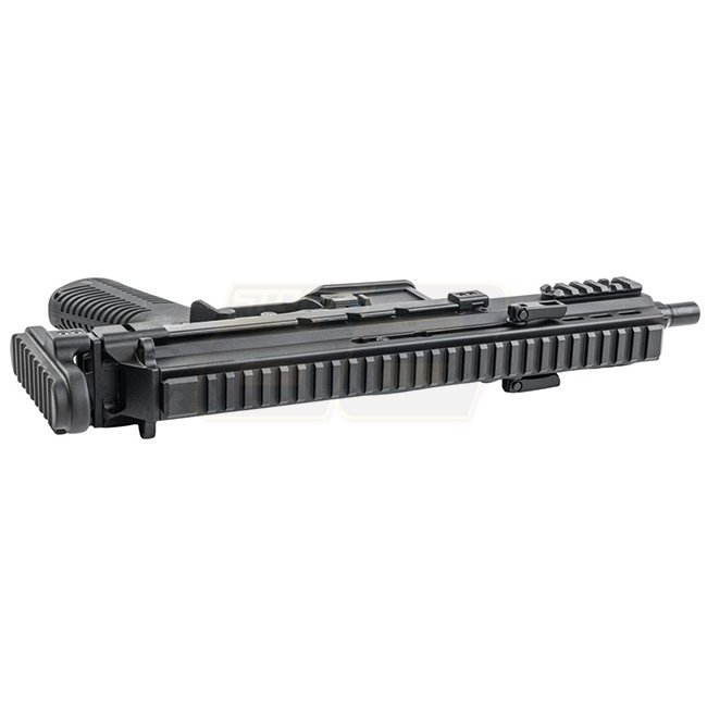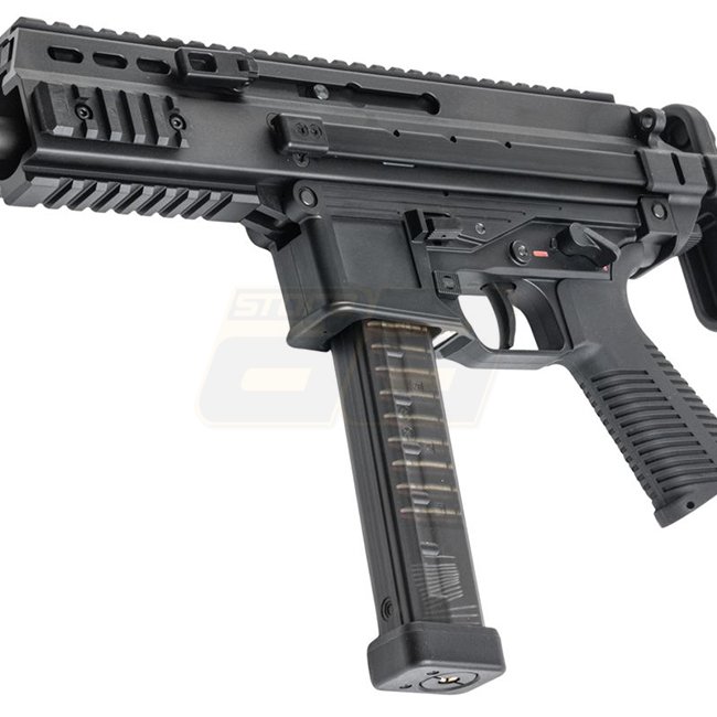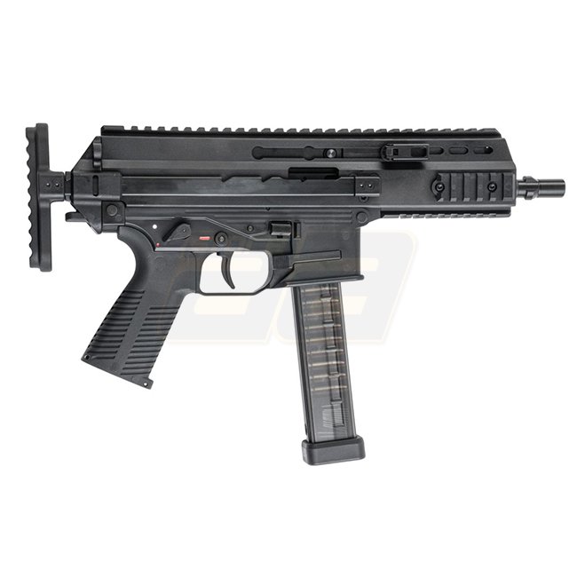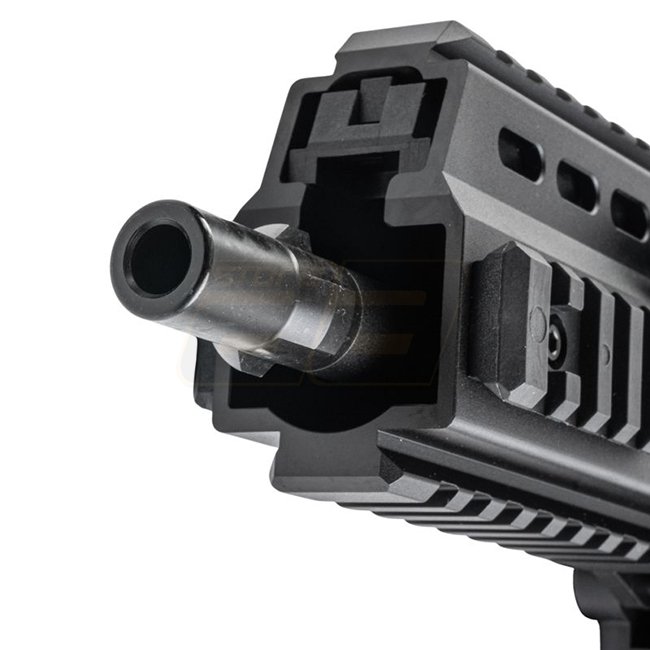 Kompaktes SMG Gas-Blowback-System in Straight-Mag-Konfiguration. Die Pro-G-Version bietet einen einstellbaren, teleskopischen PDW/Schaftaufbau, einen quad-Picatinny-Handguard und einen integralen, tracer-ready Mündungsaufsatz mit Tri-lug QD.