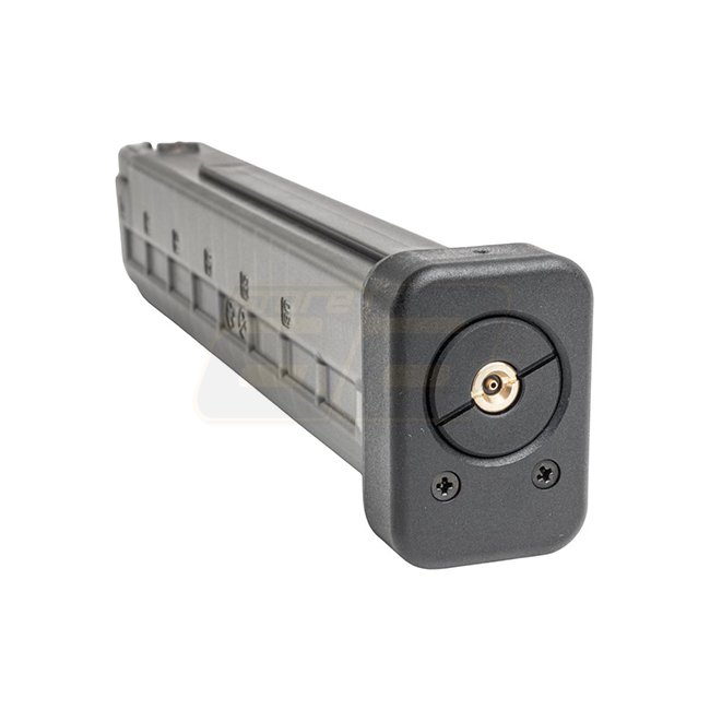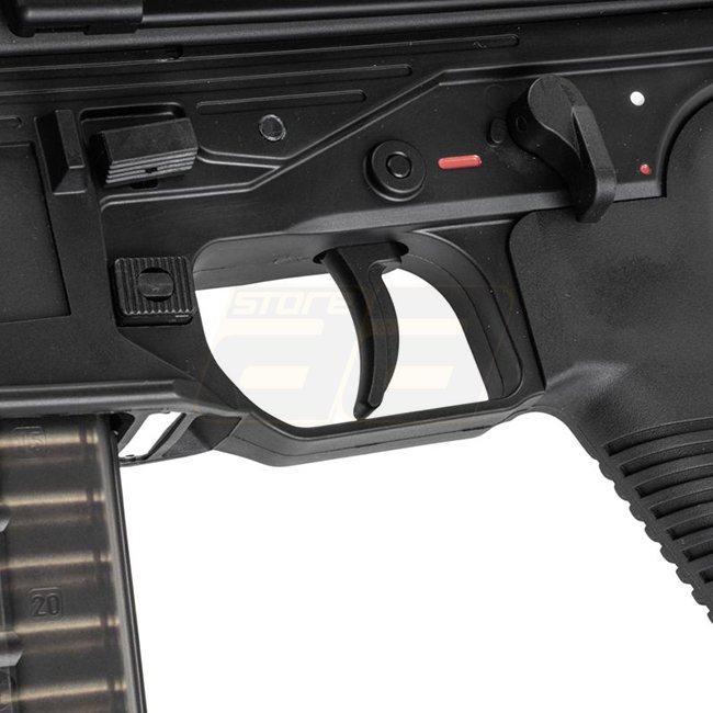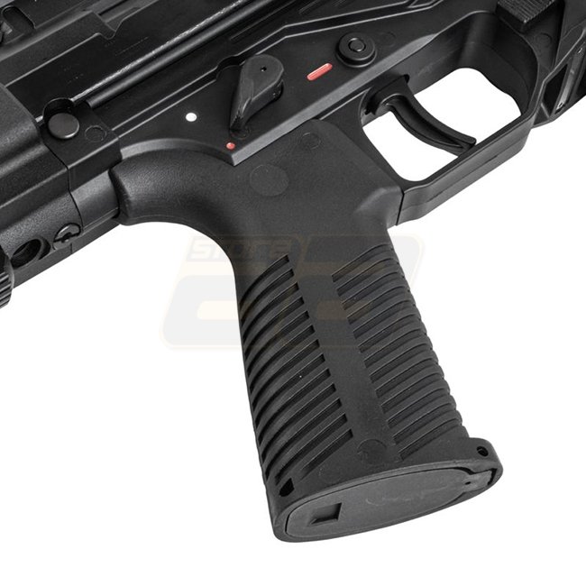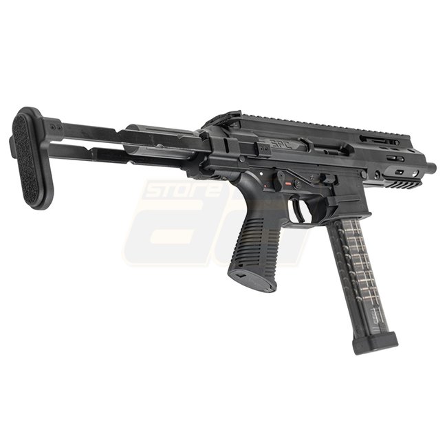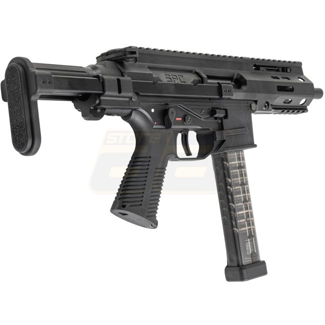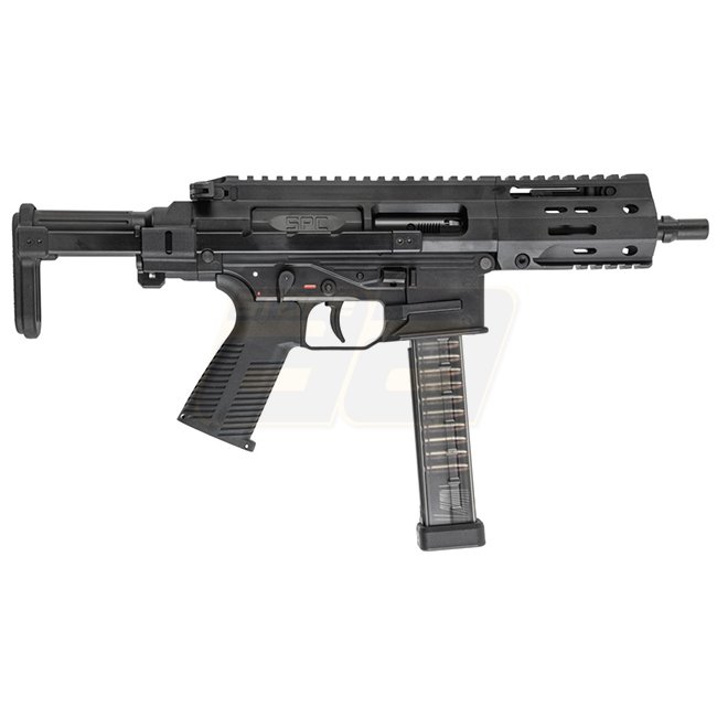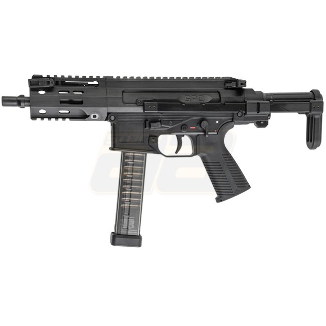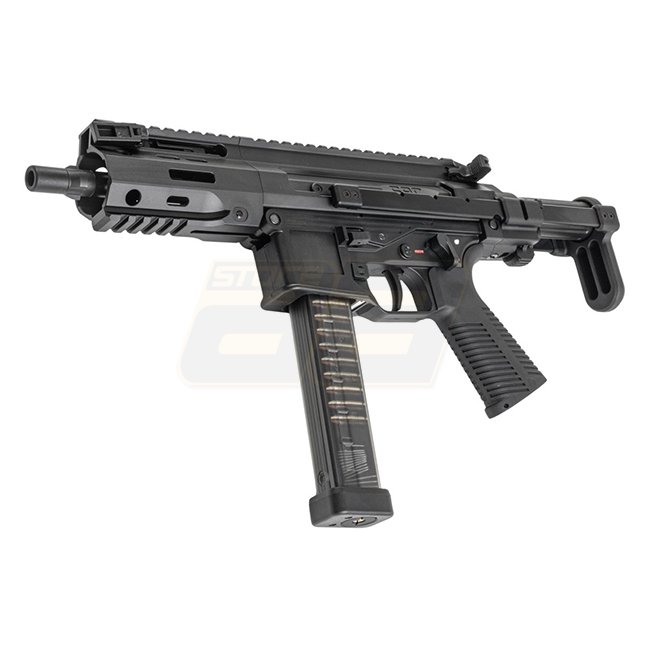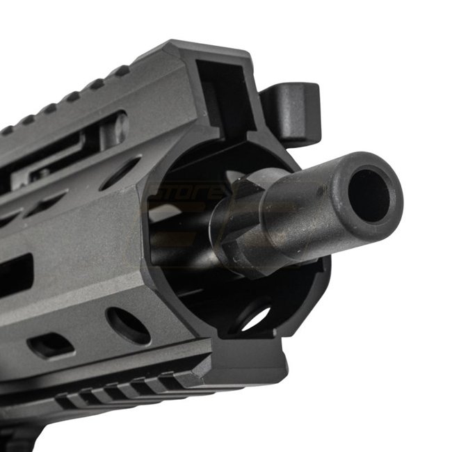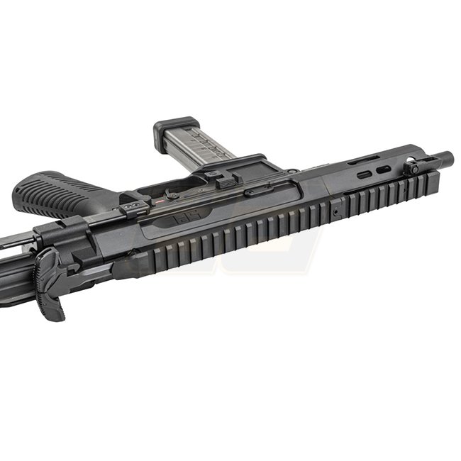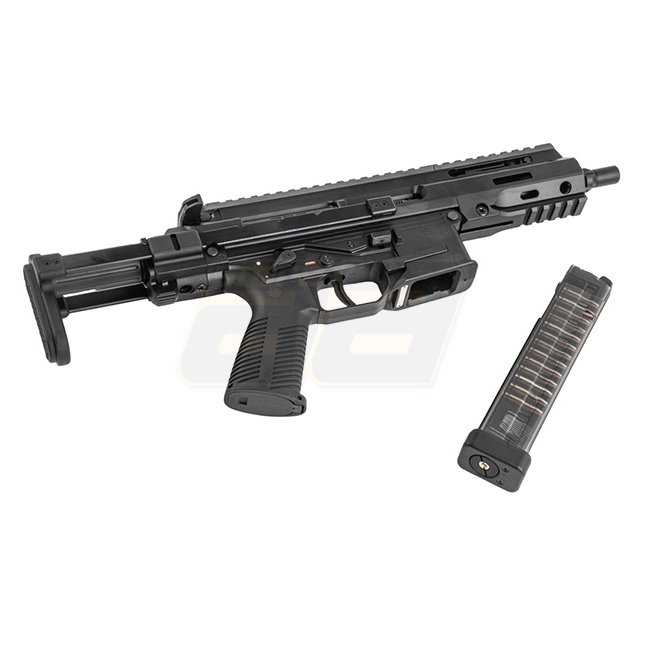 Ultra-kompaktes SMG-Gas-Blowback-System in PDW-Konfiguration mit klappbarem PDW-Schaft, hybridem M-LOK/Picatinny-Handguard und integraler, dämpfender Mündungsaufsatz (tracer-ready).