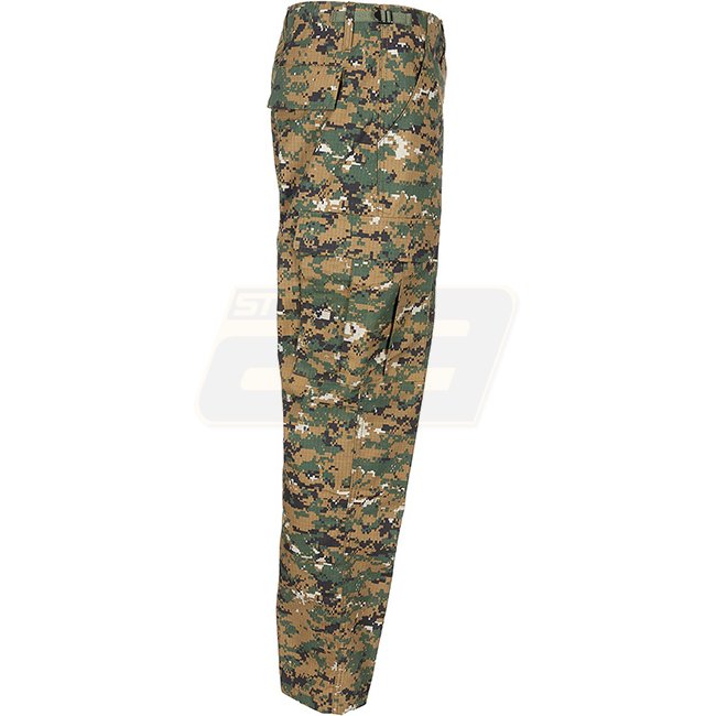 Bleiben Sie bequem und stilvoll in der MFH BDU Combat Pants Ripstop in Digital Woodland XL. Klassische US ARMY-Hosen aus 100% Baumwolle mit Knopfverschluss, mehreren Taschen, verstellbarem Bund, verstärkten Knien und Gesäß sowie verstellbarem Kordelzug am